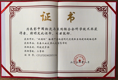 由我校管理学院宋殿辉教授主持,蔡珊珊、闫铁柱、孙广、鞠志红、 王晶、马振楠老师共同申报的科研成果《“双循环”格局下吉林省现代流通体系构建的战略选择》,荣获2024年度中国物流与采购联合会科技进步三等奖。中国物流与采购联合会科学技术奖是经科技部认定并在国家科学技术奖励工作办公室登记备案的奖项。