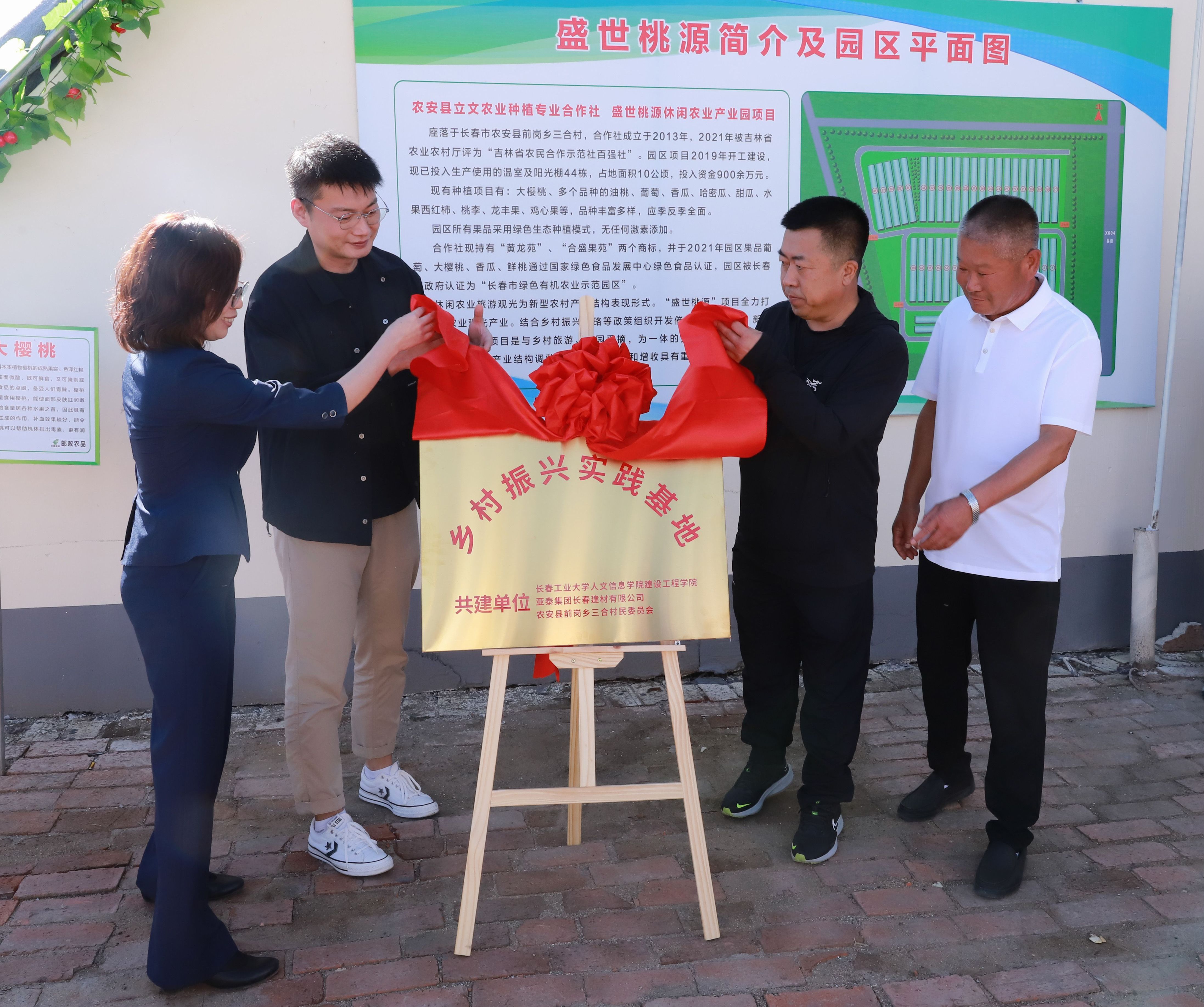 前岗乡党委书记郑庆锋、我校建设工程学院院长孙娜、亚泰集团长春建材有限公司人力资源部部长荣超群、前岗乡三合村党总支书记陶立文共同为校企地共建的“乡村振兴实践基地”揭牌。