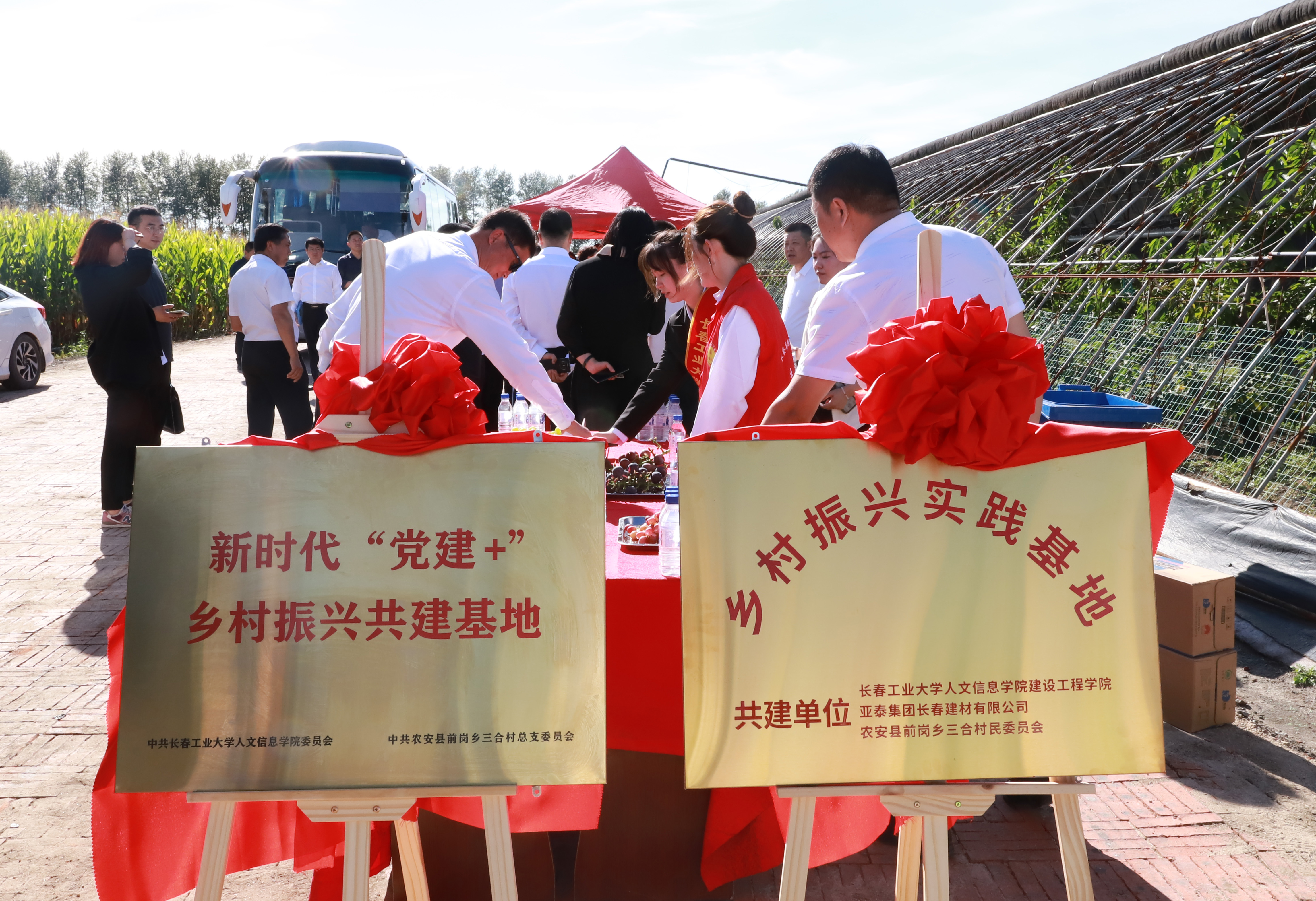 为深入贯彻落实习近平总书记在新时代推动东北全面振兴座谈会上的重要讲话精神和视察吉林重要讲话重要指示精神,以实际行动回答好“教育强省、高校何为”的时代问卷,在长春市工商联的积极推动下,9月12日,学校与农安县前岗乡三合村共建的新时代“党建+”乡村振兴基地和校企地“乡村振兴实践基地”正式揭牌,并举行共建活动。长春市委统战部、长春市工商联(总商会)副主席(副会长)、常委及农安县相关领导,我校党委相关领导和相关部门负责人出席活动。