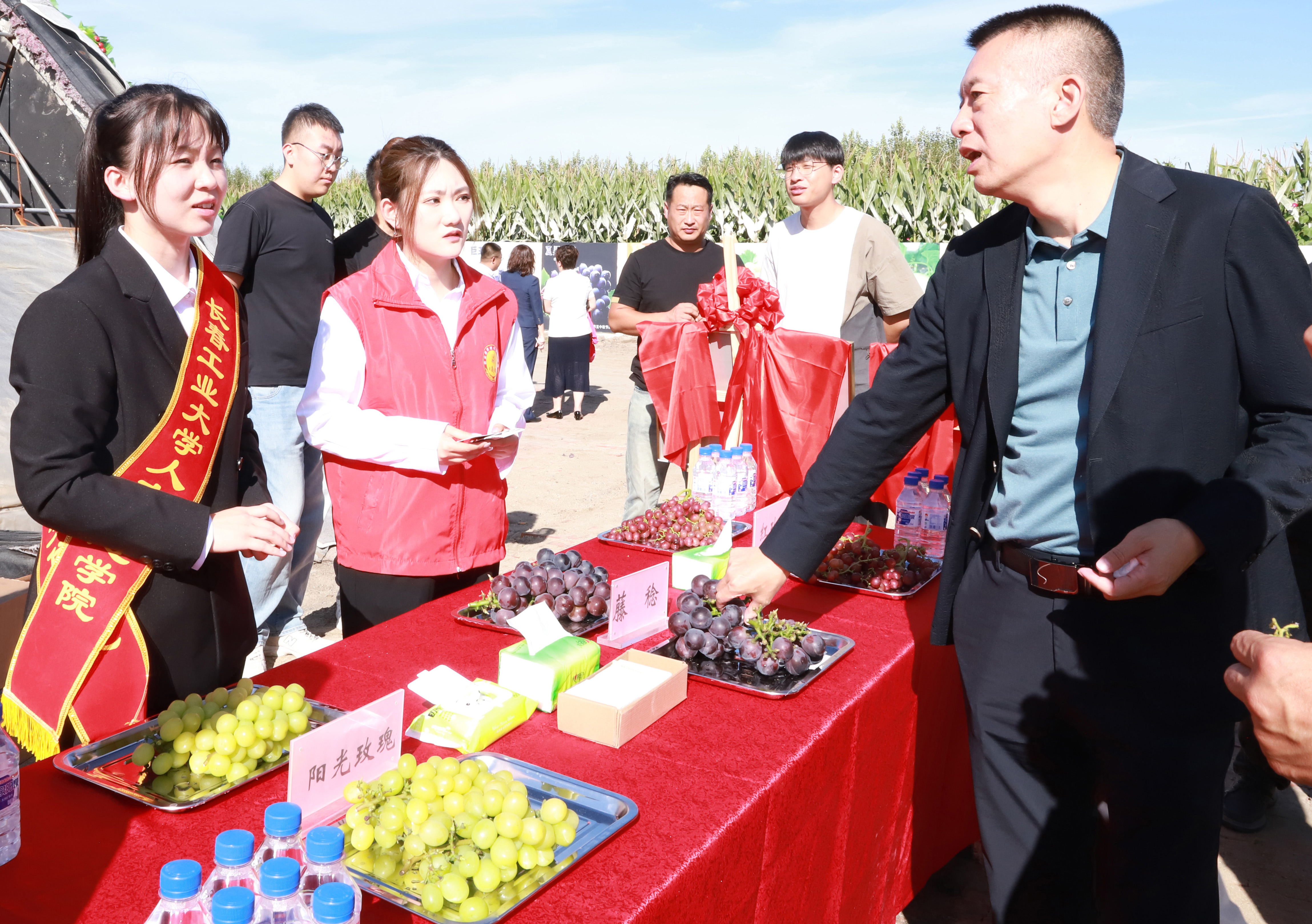 揭牌结束后,与会领导和嘉宾共同参加了三合村葡萄品鉴展销节活动。本次活动中,我校建设工程学院、商学院、艺术设计学院在环境美化、电商平台搭建、现场志愿服务等方面提供了高标准、高质量的智力支持和人力支援。