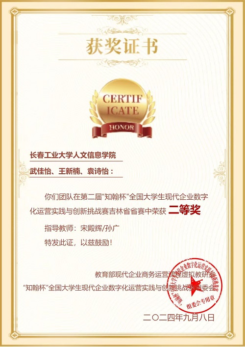 近日,由教育部现代企业商务运营课程虚拟教研室主办、重庆工商大学承办的2024年“知瀚杯”全国大学生现代企业数字化运营实践与创新挑战赛顺利落下帷幕。由我校管理学院孙广、马振楠、鞠志红、宋殿辉教师指导的3支学生代表队经过激烈的角逐,斩获3个省级二等奖。