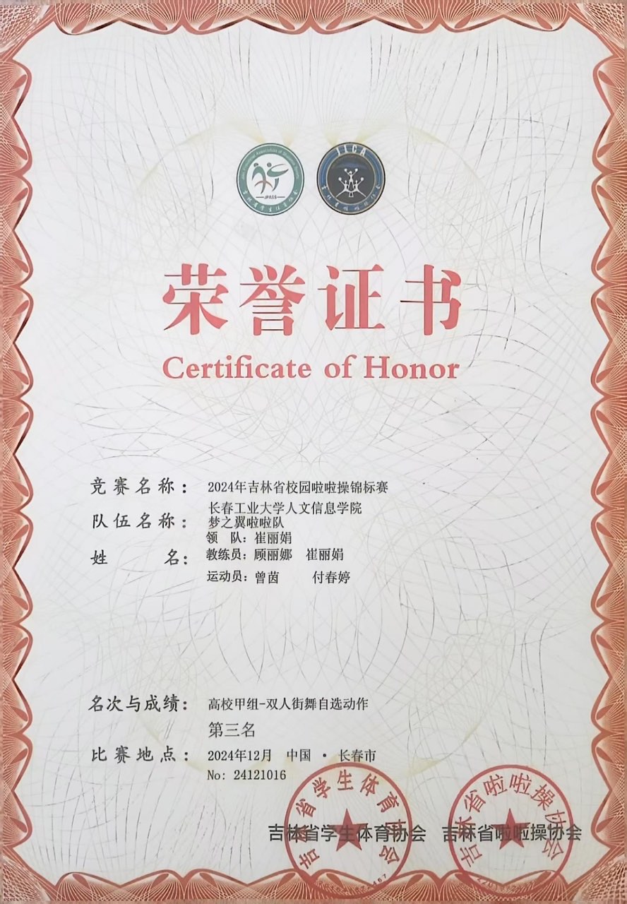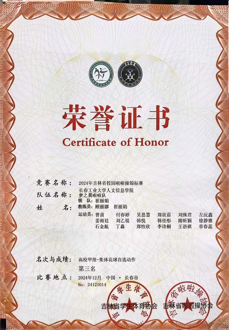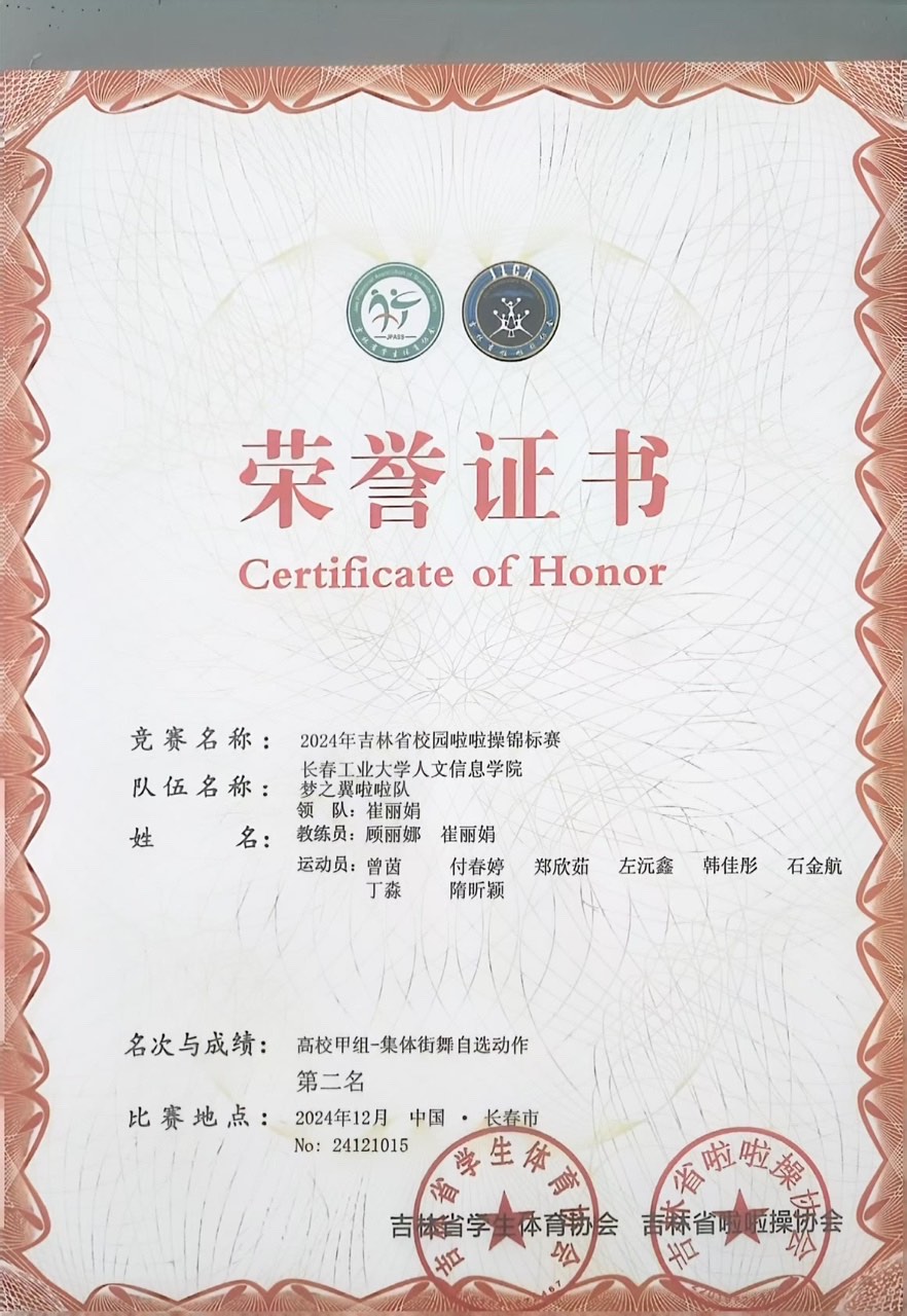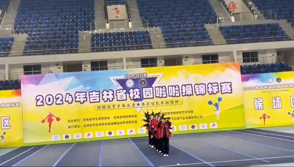 2024 年 12 月 7 日,由吉林省学生体育协会、吉林省啦啦操协会主办,吉林体育学院体育艺术学院承办的吉林省校园啦啦操锦标赛于长春奥林匹克公园篮球馆盛大开幕。我校啦啦操队在高校甲组的比赛中脱颖而出,取得了1项第二名和3项第三名的好成绩。