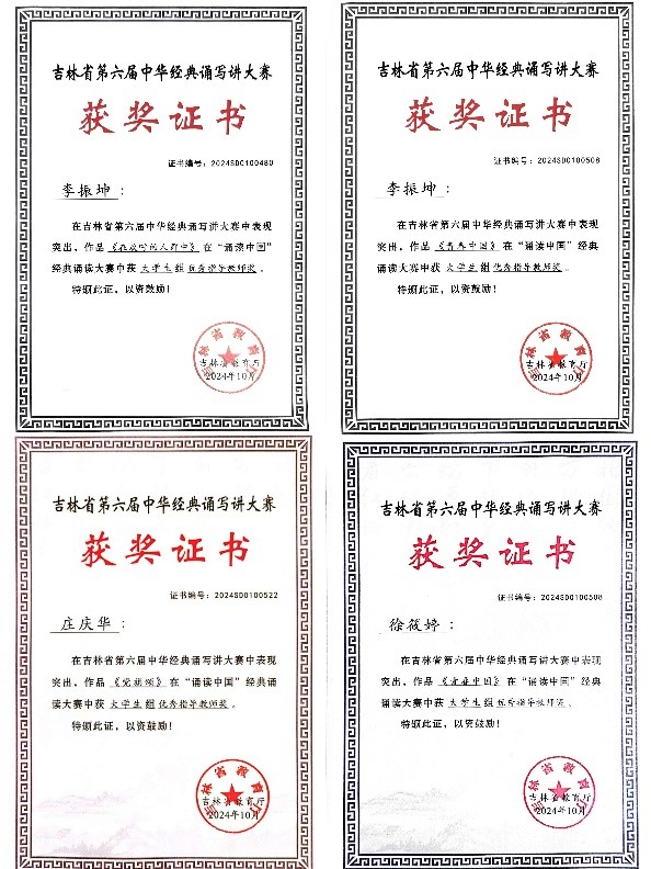 为贯彻落实党的二十大精神,服务教育强国、文化强国建设,加大国家通用文字推广力度,传承发展中华优秀语言文化,落实全国青少年读书行动,教育部、国家语委主办了以“典耀中华,赓续文脉”为主题的第六届中华经典诵写讲大赛。我校管理学院师生在大赛中荣获吉林省大学生组个人三等奖两项、团队三等奖一项的好成绩。