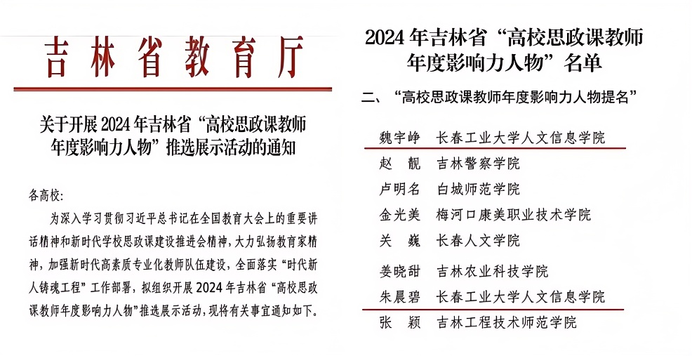 为深入学习贯彻习近平总书记在全国教育大会上的重要讲话精神和新时代学校思政课建设推进会精神,大力弘扬教育家精神,推动新时代高素质专业化教师队伍建设,全面落实“时代新人铸魂工程”工作部署,表彰和推广在思政课教学及研究领域成绩显著的教师,吉林省教育厅举办了2024年度“高校思政课教师年度影响力人物”推选展示活动。经过学校精心推荐与专家组的严格评审,我校马克思主义学院的魏宇峥、朱晨碧两位教师脱颖而出,喜获2024年度“高校思政课教师年度影响力人物提名”。