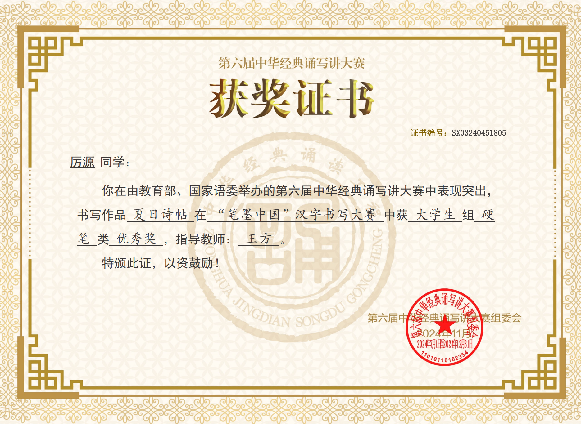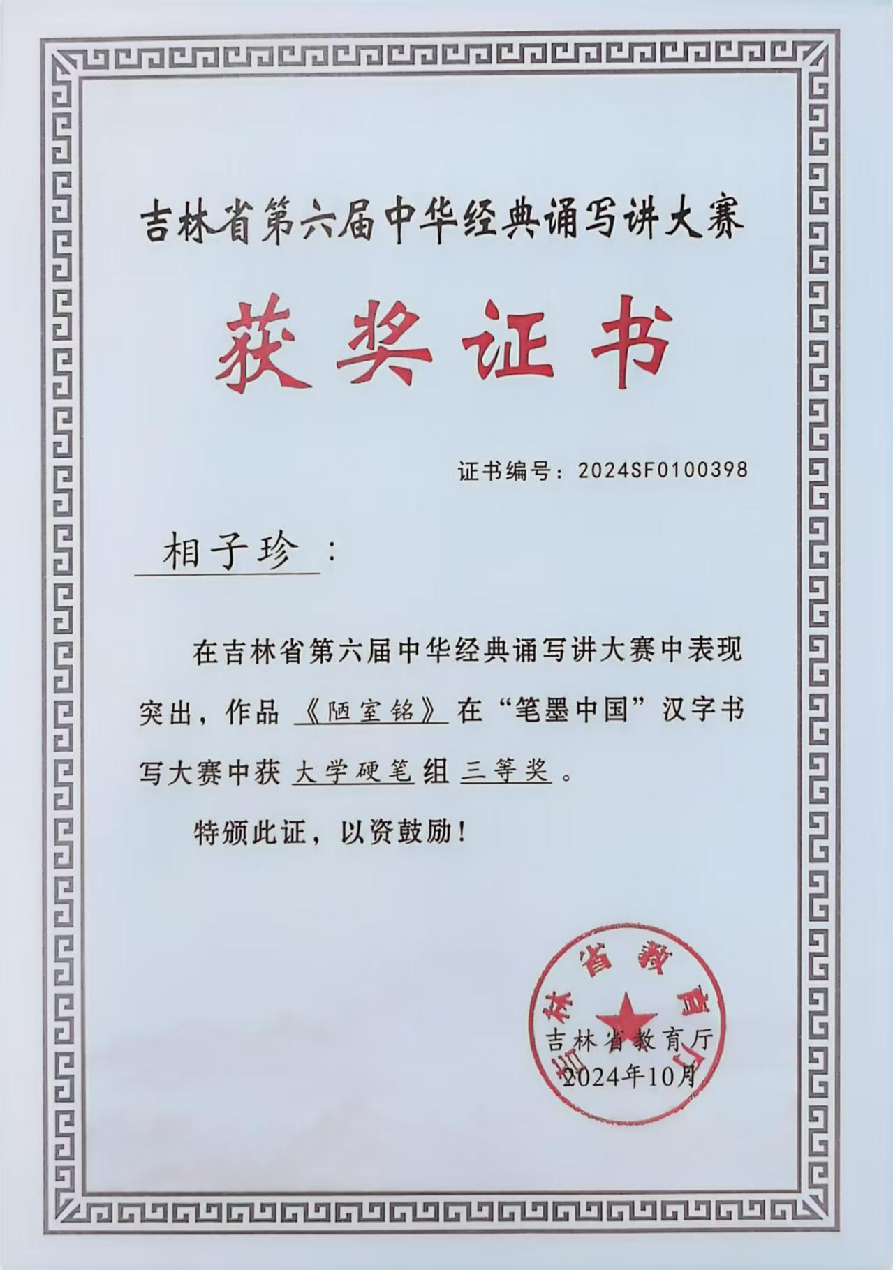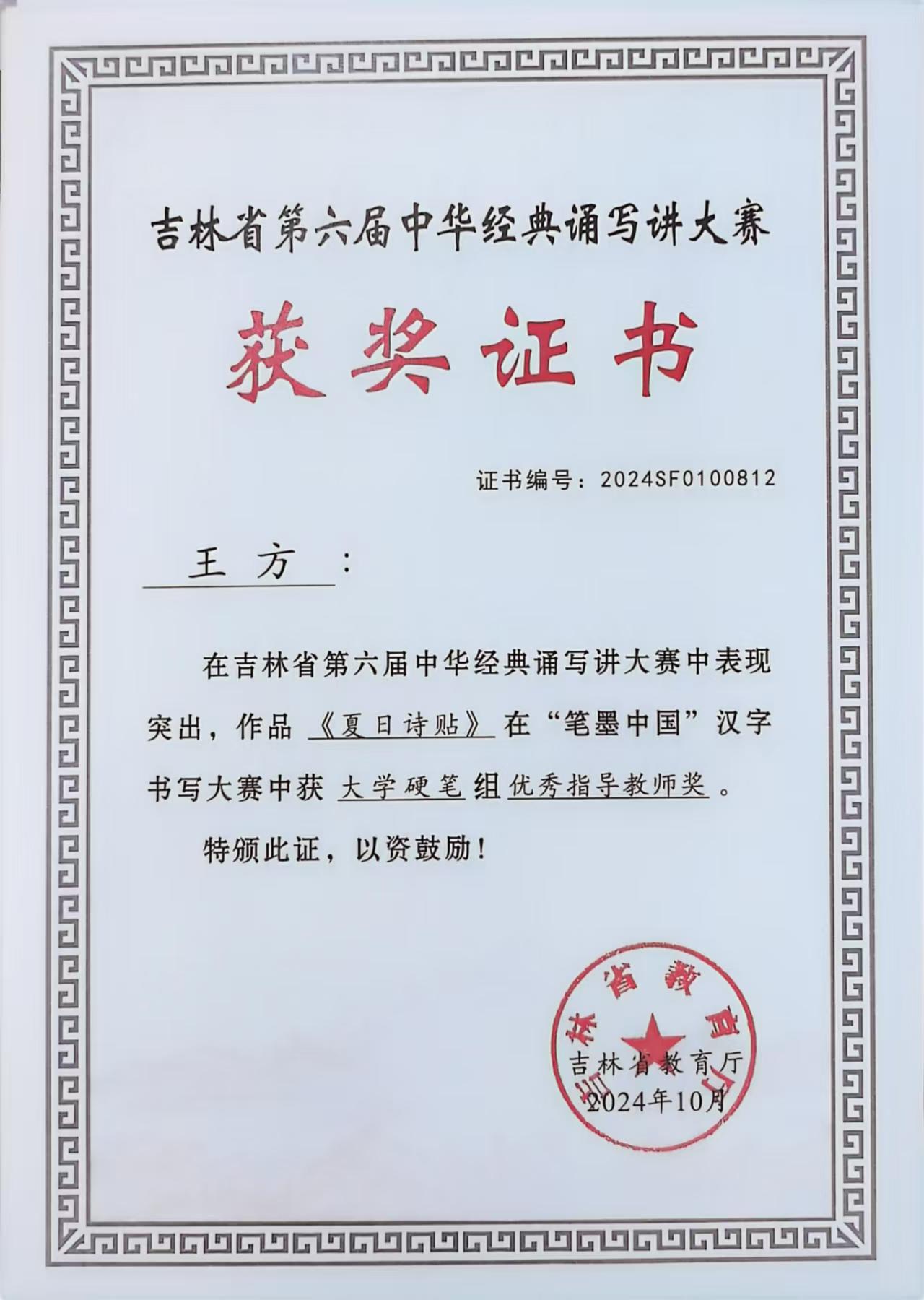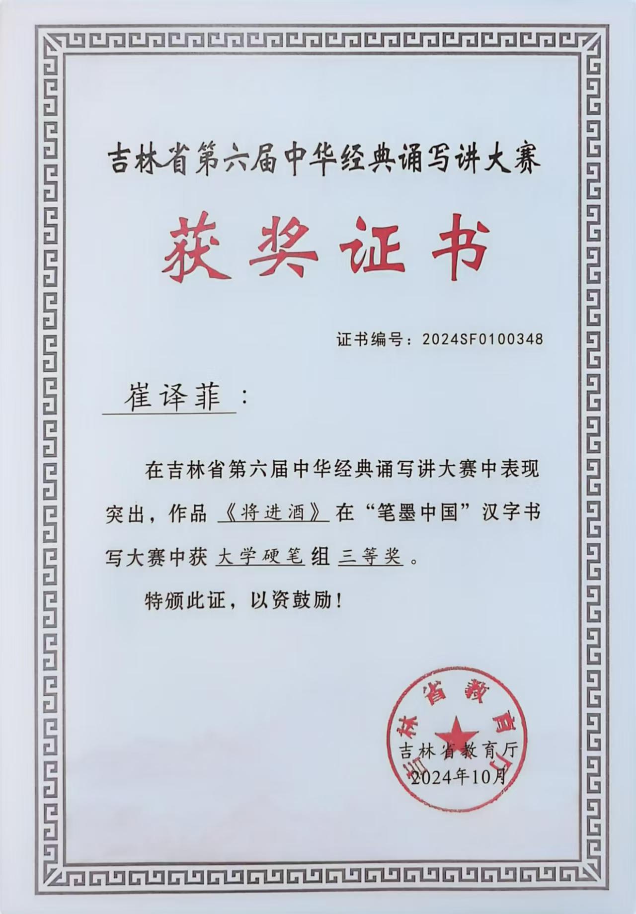 在刚刚结束的由教育部、国家语委举办的第六届“笔墨中国”经典诵写讲大赛中,我校法学院学生厉源的作品《夏日诗贴》获省级大学硬笔组一等奖,管理学院学生相子珍的作品《陋室铭》、计算机科学与工程学院学生崔译菲的作品《将进酒》、电气与电子工程学院学生刘禹欣的作品《将进酒》获省级大学硬笔组三等奖,王方获优秀指导教师奖。其中厉源凭借其卓越的作品《夏日诗贴》,直接进入国赛,并在全国4119件作品中最终荣获国家级优秀奖,突破了我校学生的最好成绩。