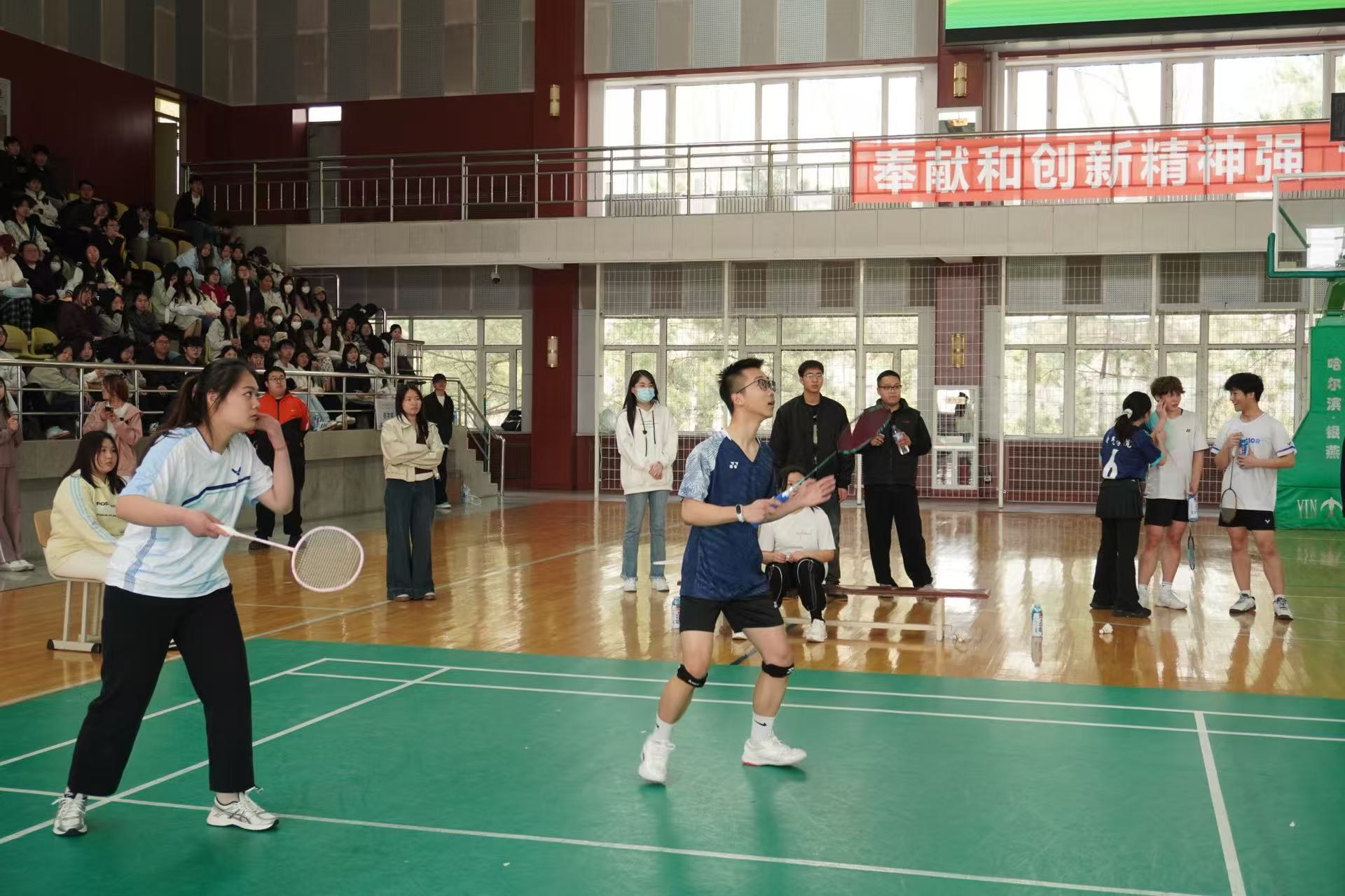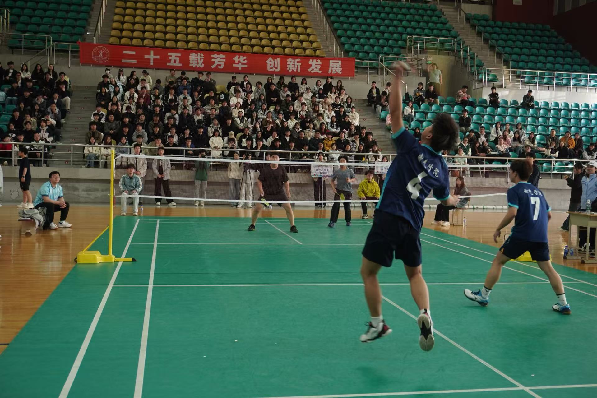4月17日中午,学校2025年大学生阳光体育节——第二届“领航杯”学生羽毛球团体赛首场比赛在体育馆顺利举办。学校党委副书记周丹,学校办公室主任张孝强,学生工作处处长庞旭,校团委书记孟晔,各学院党总支书记、团委书记、部分辅导员以及体育教研部部分教师现场观赛。