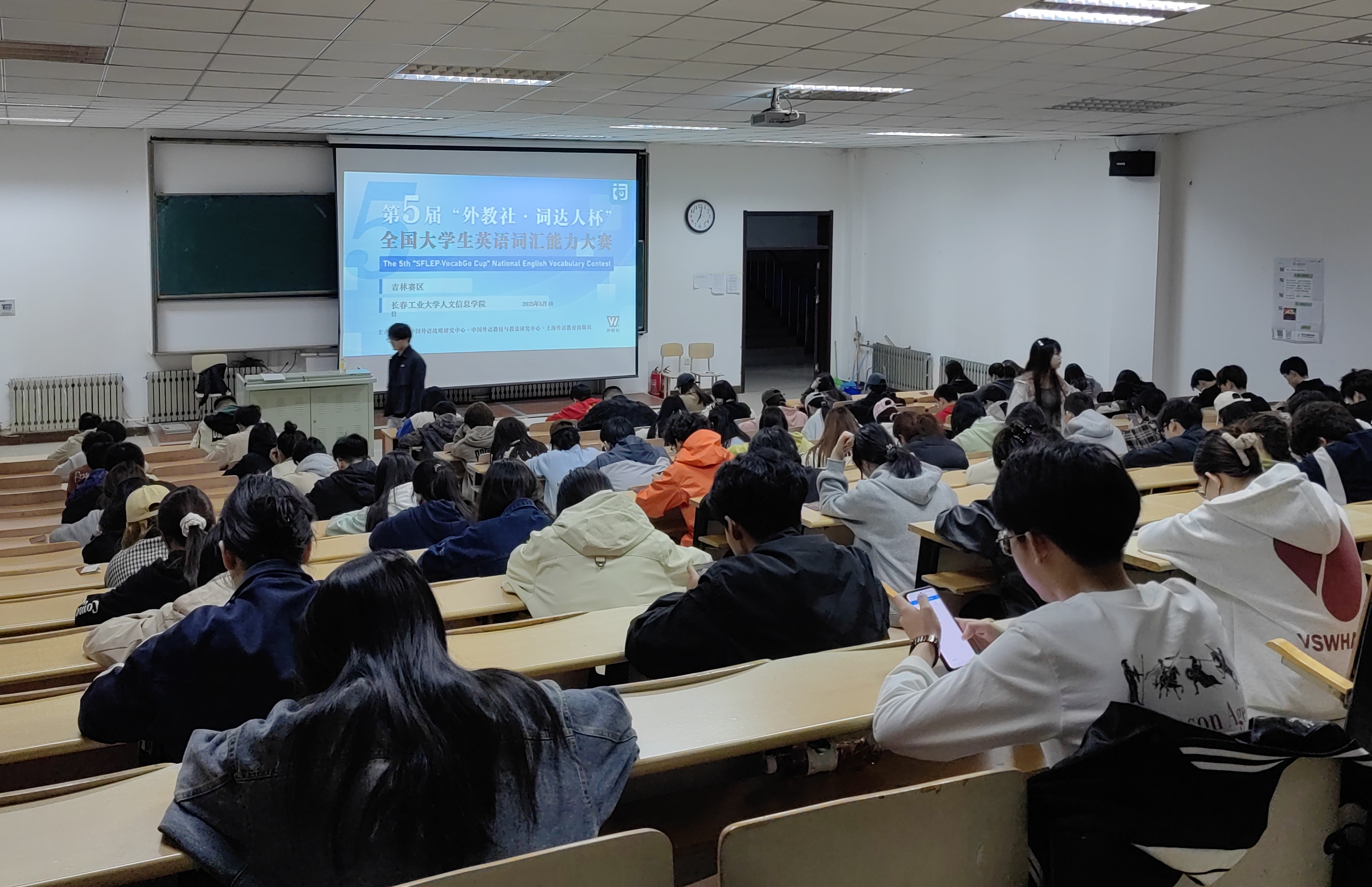 5月10日19:00-20:00时,第五届“外教社·词达人杯”全国大学生英语词汇能力大赛吉林省省赛在学校北校区阶梯A、B教室进行。全省1520名学生参赛,我校英语专业组23名学生、非英语专业组188名学生入围本次省赛。经过激烈角逐,7名学生获得省二等奖,11名学生获得省三等奖。