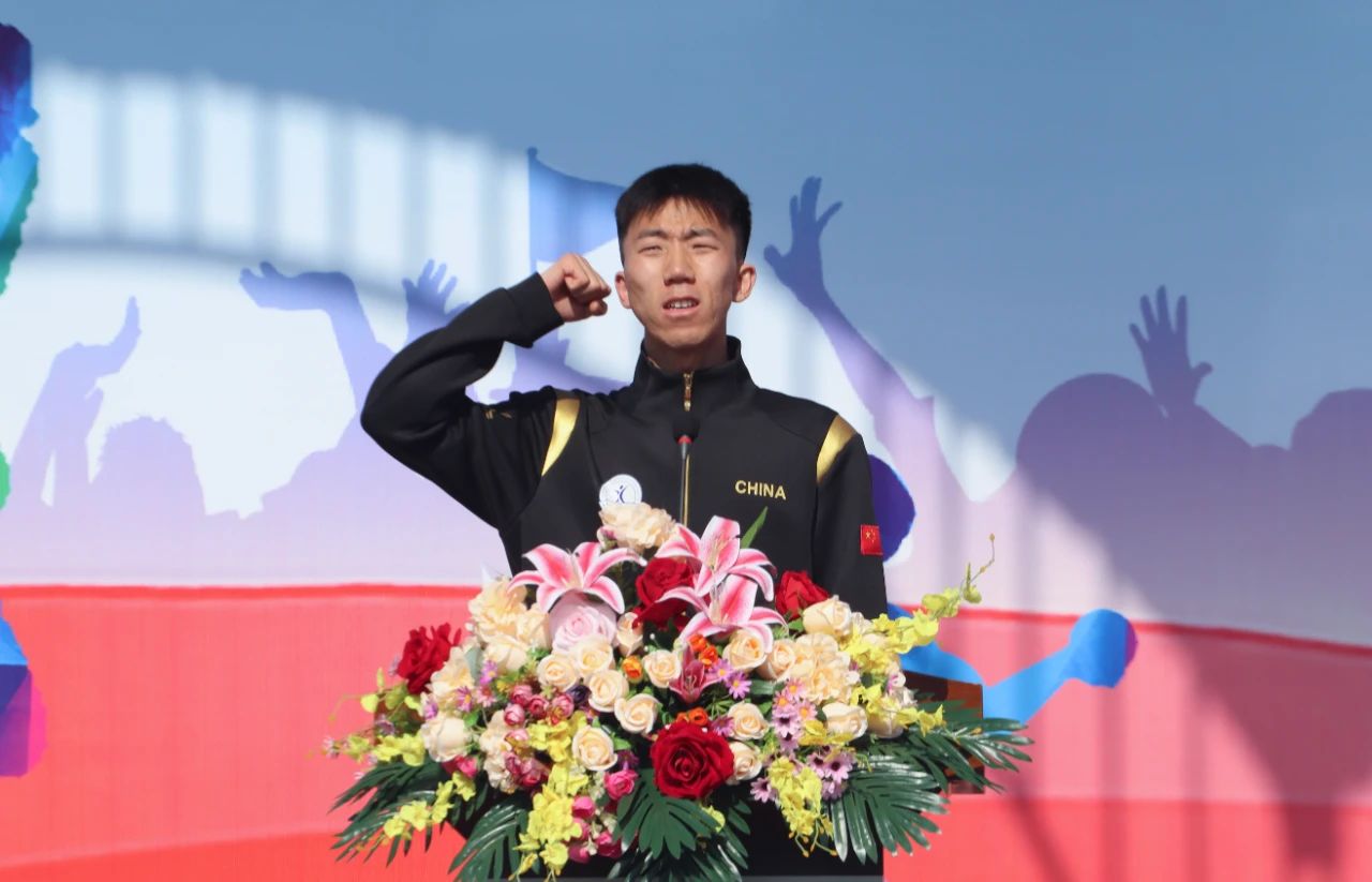 运动员代表、电气与电子工程学院学生闫旭,裁判员代表、体育教研部教师崔丽娟分别代表运动员和裁判员宣誓。