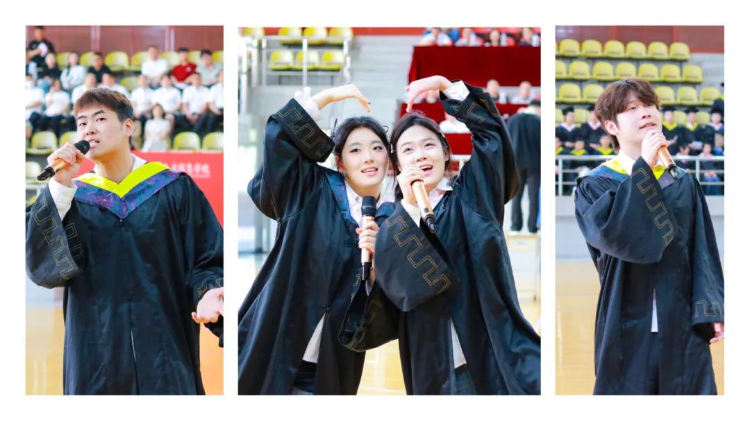 典礼开始前,与会师生们共同观看了毕业纪念片《星程》,影片不仅展现了毕业生不同的人生选择和多元的成长路径,也生动地表达了对母校的热爱和祝福。四名毕业生代表现场深情唱响了《不说再见》,表达了对校园生活的无限眷恋和对未来的美好期待。