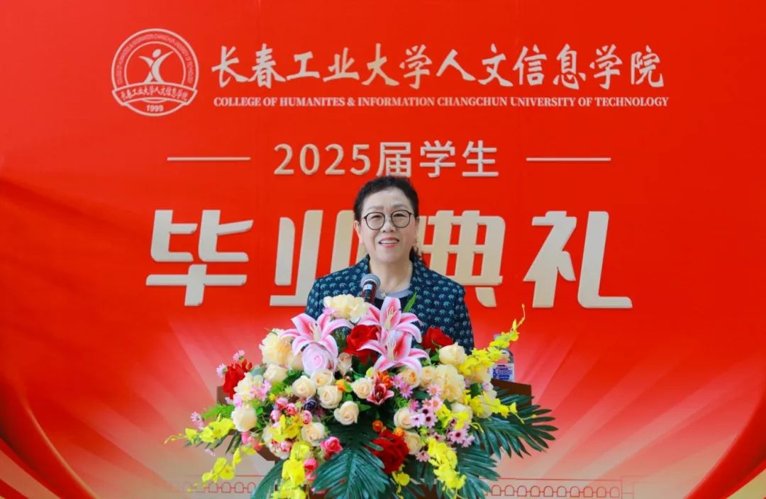 外国语学院院长唐艳玲教授代表全校教师发言。祝贺同学们即将开启人生新的征程,奔赴星辰大海,去追逐梦想,去创造属于自己的辉煌!表达了老师对同学们的殷切希望,并祝愿同学们毕业快乐、前程似锦!