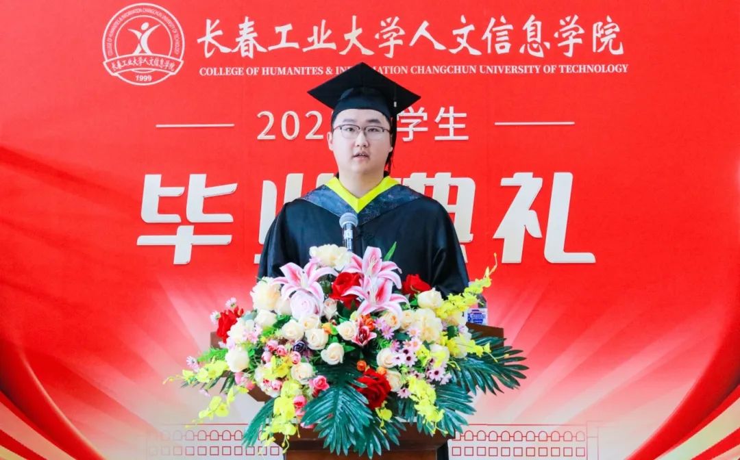 商学院陈诗舫同学作为毕业生代表发言,表达了对母校和领导、老师的感恩之情以及对未来的深深憧憬,并表示将铭记“成人、成才、成功”的校训,在青春的赛道上接力奋斗,在广阔的人生中发光发热,为母校和学院争光。
