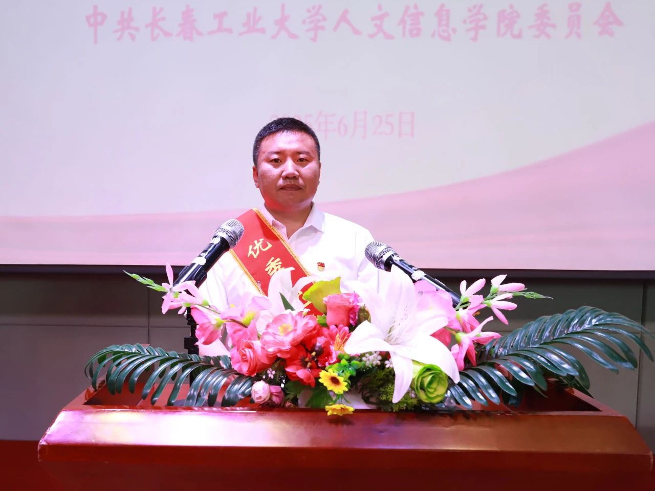 党委副书记周丹宣读《中共长春工业大学人文信息学院委员会关于表彰2023-2025年度优秀共产党员、优秀党务工作者和先进基层党组织的决定》。
