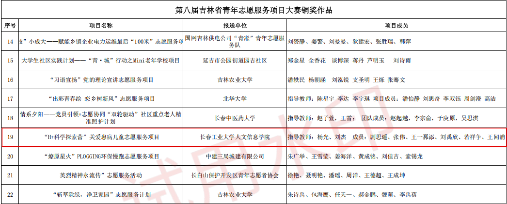 近日,由共青团吉林省委主办的第八届吉林省青年志愿服务项目大赛圆满落幕。经学校团委推荐、材料审核、答辩路演等多轮评审,我校电气与电子工程学院团委申报的“H+科学探索营”关爱患病儿童志愿服务项目荣获大赛铜奖。