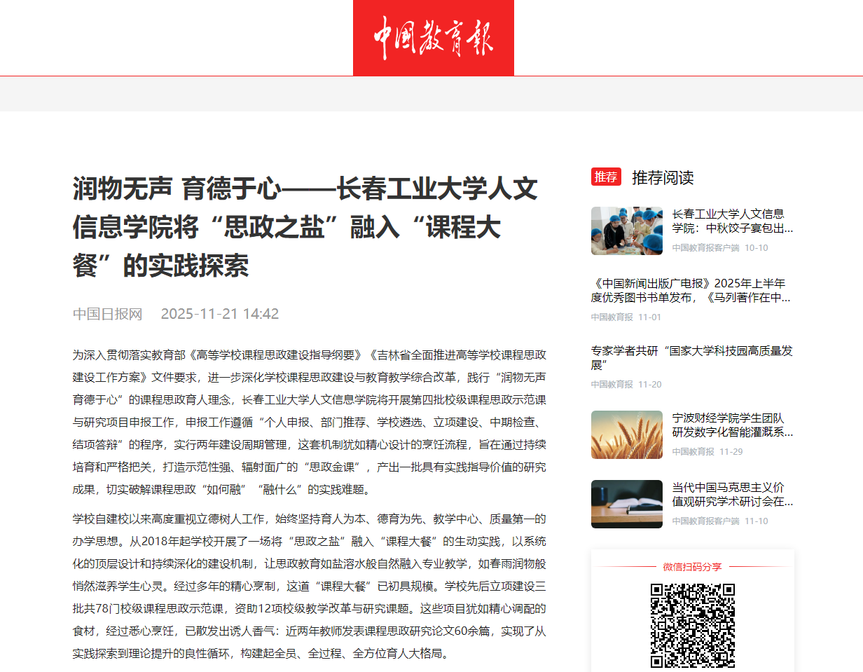 近日,中国日报网等媒体以《润物无声 育德于心——长春工业大学人文信息学院将“思政之盐”融入“课程大餐”的实践探索》为题,深度报道了我校课程思政建设与教育教学综合改革工作,特别聚焦了学校课程思政建设系统化的顶层设计和持续深化的建设机制,以及学校让思政教育如盐溶水般自然融入专业教学的特色做法。