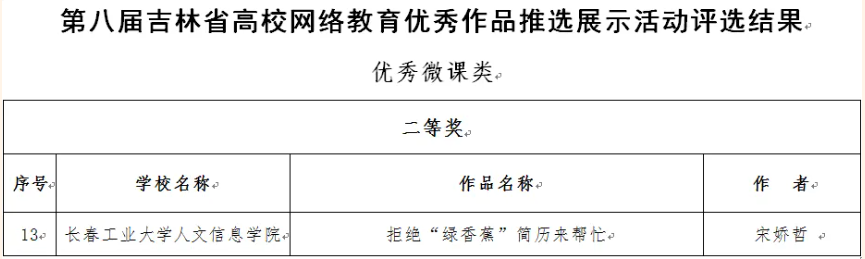 近日,吉林省教育厅下发了《关于公布第八届吉林省大学生网络文化节和高校网络教育优秀作品推选展示活动获奖名单的通知》。经作品申报、资格审核、专家评审,我校学生作品在吉林省“大学生网络文化节”活动中获得二等奖4项、三等奖1项;我校教师作品在吉林省“高校网络教育优秀作品推选展示活动”中获得二等奖1项。
