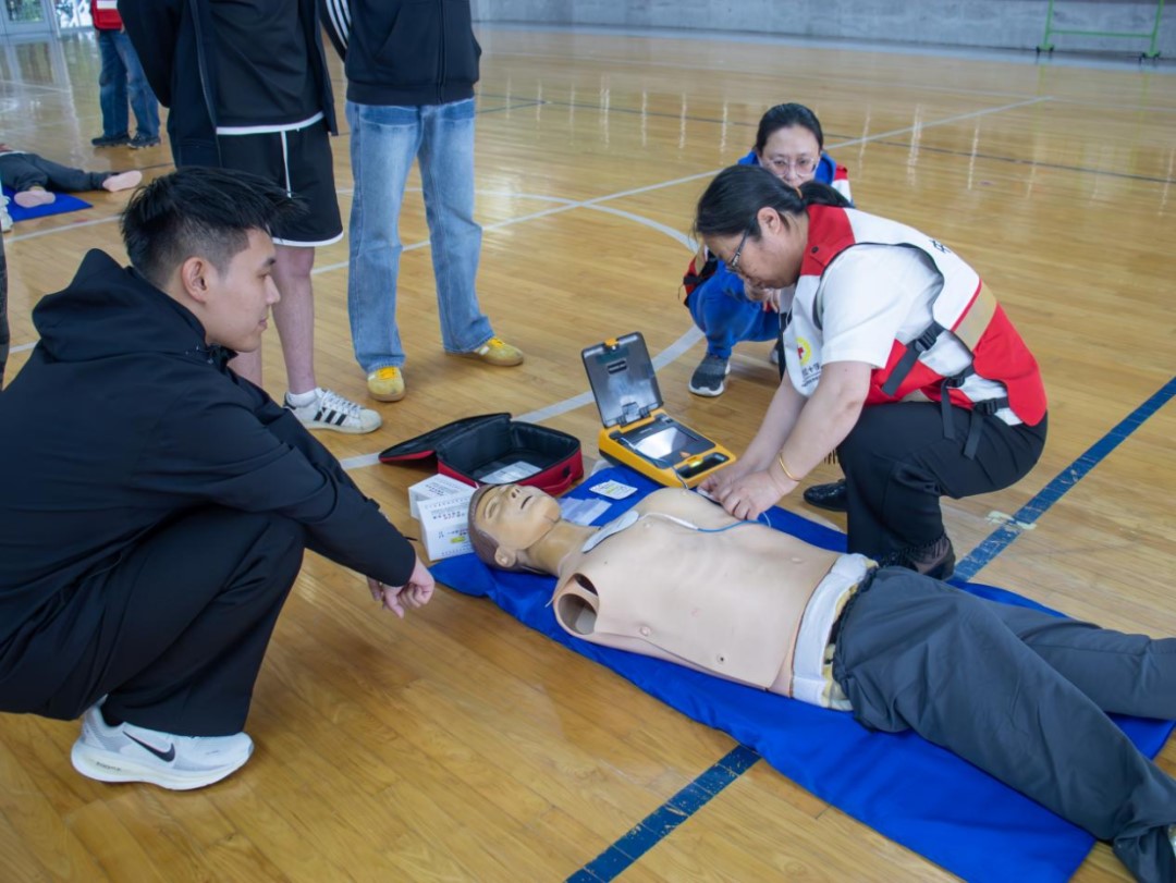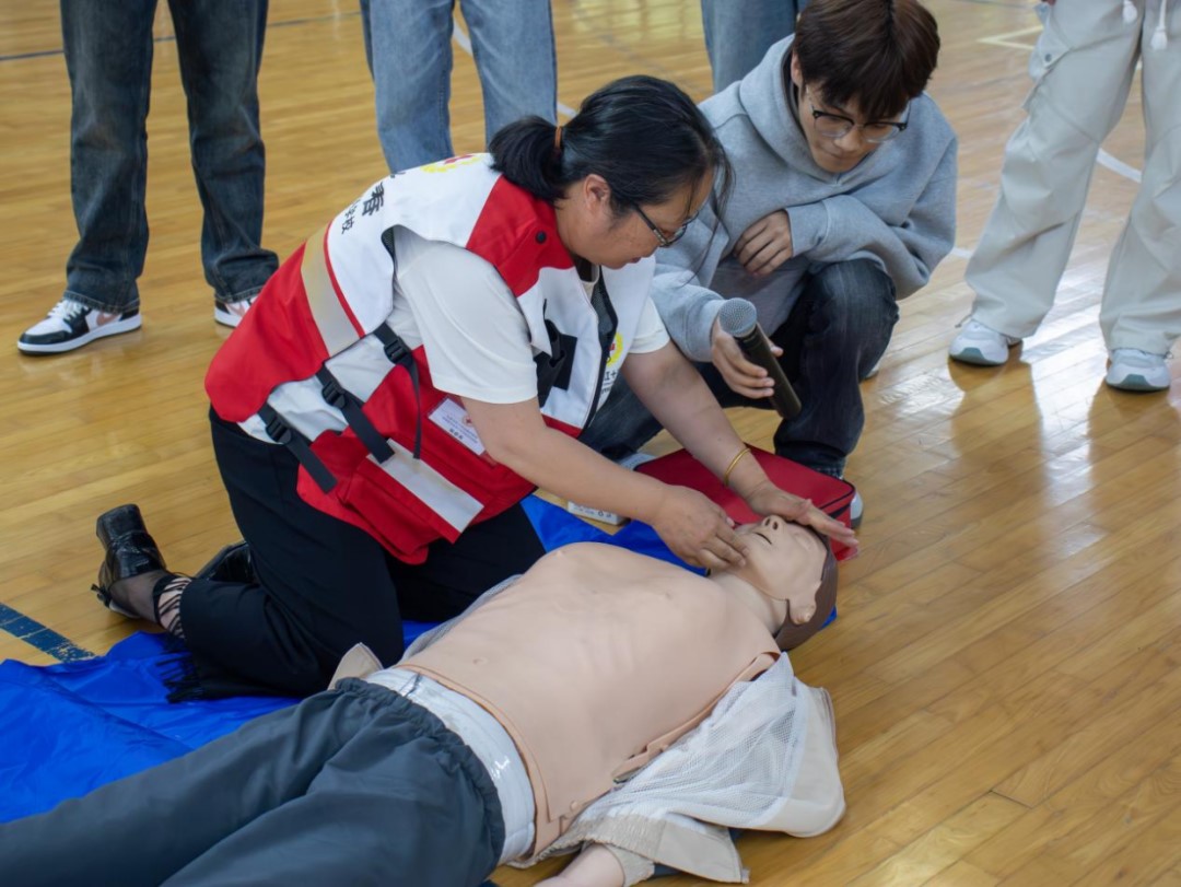 张春英重点从中国红十字的主要工作、心肺复苏(CPR)概述及程序、自动体外除颤器(AED)原理及用法三方面进行讲授。同时,结合案例数据、点位讲解和医疗术语,为师生带来一堂实用、专业的急救技能培训课。
