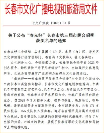 近日,在长春市第三届市民合唱季活动中,我校“梦之帆”教工合唱团与全市众多参赛队伍同台竞技,凭借出色表现与协作精神,荣获“优秀组织奖”,彰显了我校教职工良好的艺术素养与团队凝聚力。