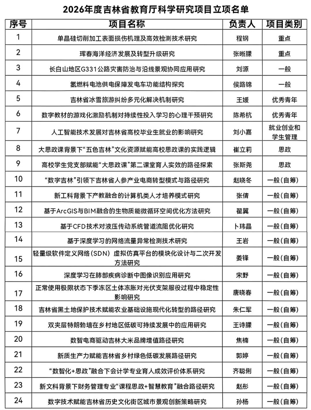 近日,吉林省教育厅正式公布2026年度吉林省教育厅科学研究项目立项名单,我校程钢等24位教师申报的项目成功获批立项,其中重点项目2项、一般项目2项、优秀青年项目2项、就业创业和学生管理专项1项、思想政治工作专项2项、一般(自筹)项目15项。