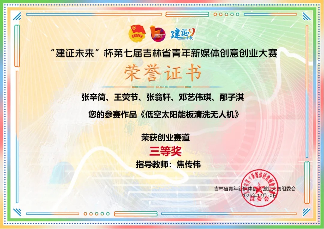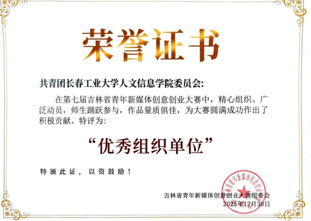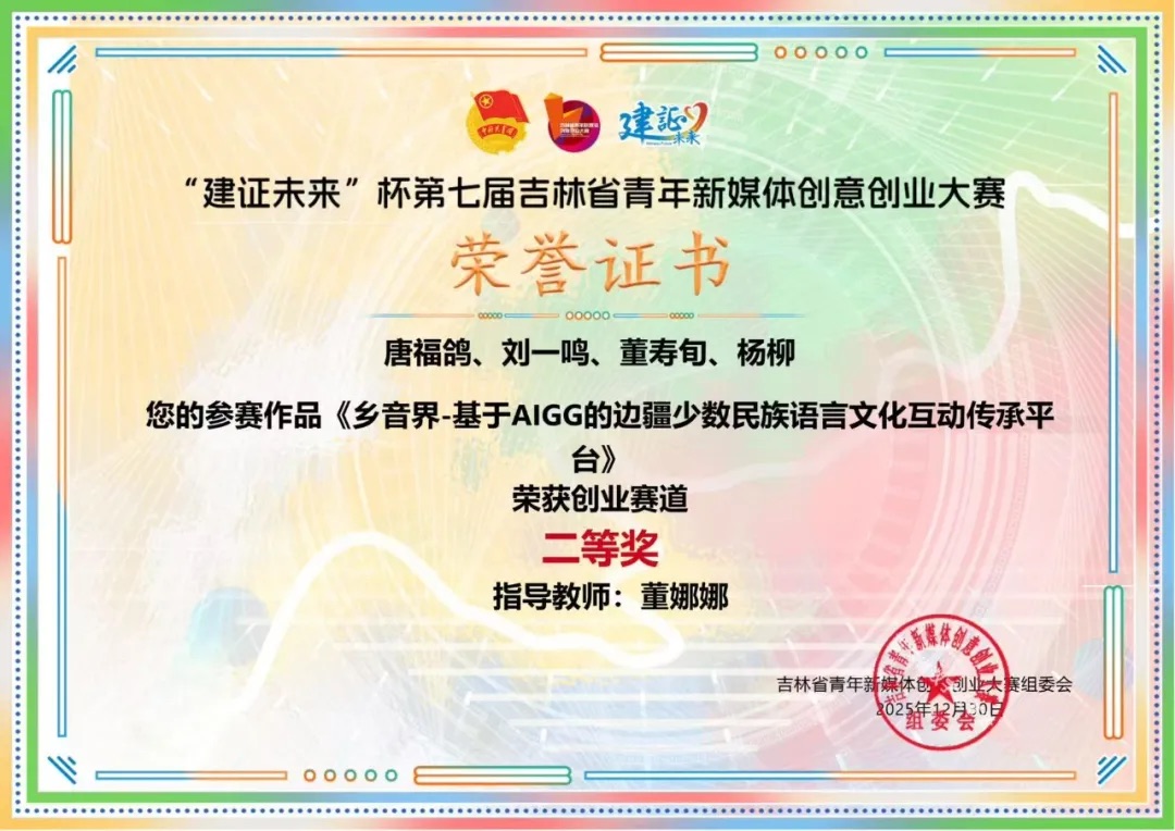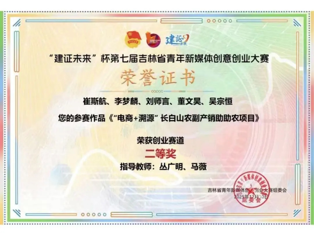 近日,由共青团吉林省委主办的“建证未来”杯第七届吉林省青年新媒体创意创业大赛圆满落幕。该赛事是吉林省教育厅纳入学科竞赛名录的省级重点赛事。我校学子在赛事中斩获创业赛道二等奖2项(每项奖金3000元)、设计赛道二等奖1项(奖金3000元)、创业赛道三等奖1项(奖金1600元),充分展现了我校学子在新媒体领域的创新创业活力与专业素养。此次大赛全省仅十所高校获评“优秀组织单位”,我校团委凭借扎实的组织筹备工作获此殊荣。