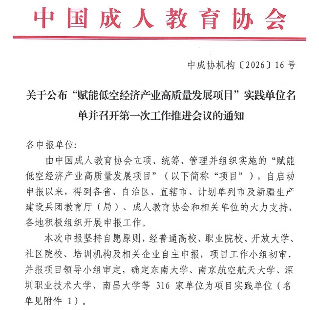 近日,中国成人教育协会正式公布“赋能低空经济产业高质量发展项目”实践单位名单,我校“一核引领、两翼支撑、三维融合——低空经济产业人才赋能计划项目”成功获批首批“赋能低空经济产业高质量发展项目”实践单位,与东南大学、南京航空航天大学等316家高校及企业共同跻身全国低空经济先行阵营。