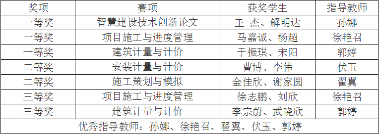 学院领导高度重视本次比赛,比赛准备历时3个多月。我院工程管理系5位指导教师利用暑假到企业参加师资培训,并做好参赛选手的选拔工作和组织学生积极备赛。本次大赛我院共派出9支代表队参加全部5项比赛,取得佳绩: