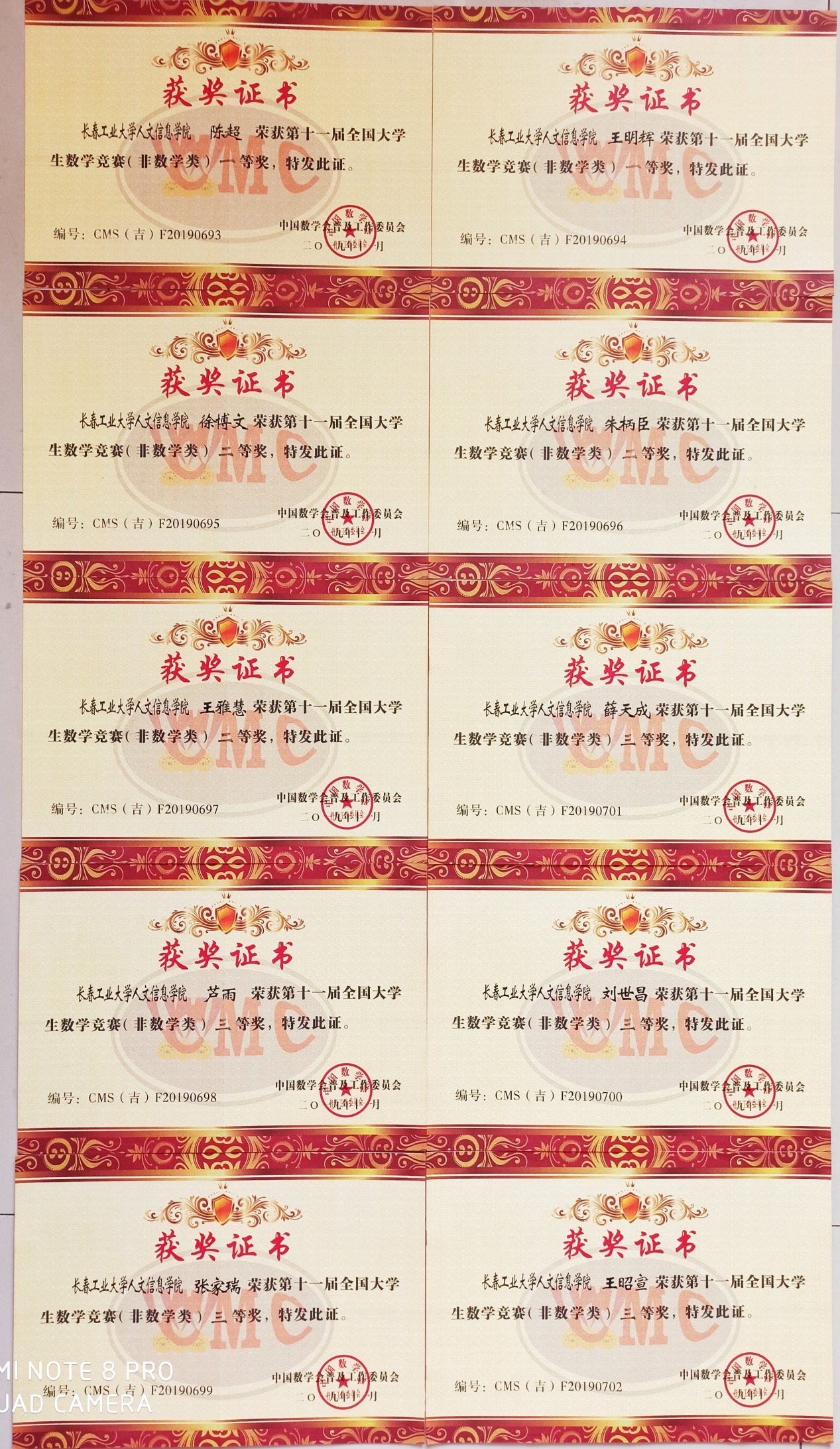 2019年10月26日,竞赛在东北师范大学举行,我院共有35名同学参赛,同来自吉林大学,东北师范大学等30多所高校3000余名学子共同竞技。我院学生成绩优异,分别获得国赛一等奖2人、二等奖3人、三等奖5人,张育梅老师荣获全国大学生数学竞赛优秀指导教师称号;还有24名同学获得吉林省大学生数学竞赛一、二等奖。