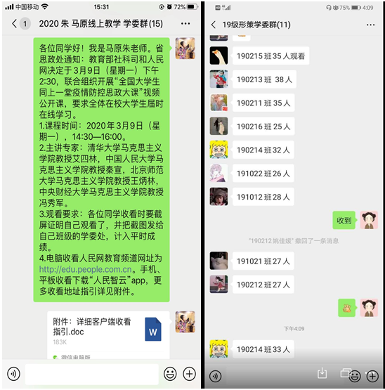 3 月 9 日,教育部社科司通知,“全国大学生同上一堂疫情防控思政大课”通过人民网、人民智云客户端、咪咕视频等客户端在全国直播。我院全体领导班子、思政教师、辅导员与全校万余学生网上共同收看学习。为了提高学习效果,学院进行了认真组织,思政教师和辅导员通过超星学习通平台,微信、QQ等方式对学生进行了学习动员,并要求学生以学习截图、微视频、心得体会等形式及时反馈学习成果。