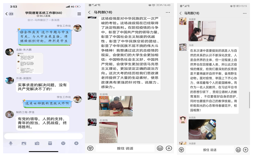 新冠肺炎疫情发生以来,学院认真贯彻落实习近平总书记关于新冠肺炎疫情防控工作的重要讲话和指示精神,严格落实学校“停课不停学”的工作要求,谋划在前,分工明确,精心组织。2月24日,借助超星学习通平台,微信、QQ等软件,我院在全省各高校中率先开讲思政线上第一课:战“疫”我们在一起。通过线上小课堂和思政大课堂的学习,结合同学们的亲身体验,我院大学生同学深深的被我们中国精神、中国力量、中国智慧、中国制度、中国情怀深深振动,更加深刻地理解新一代大学生的“使命、责任与担当”。