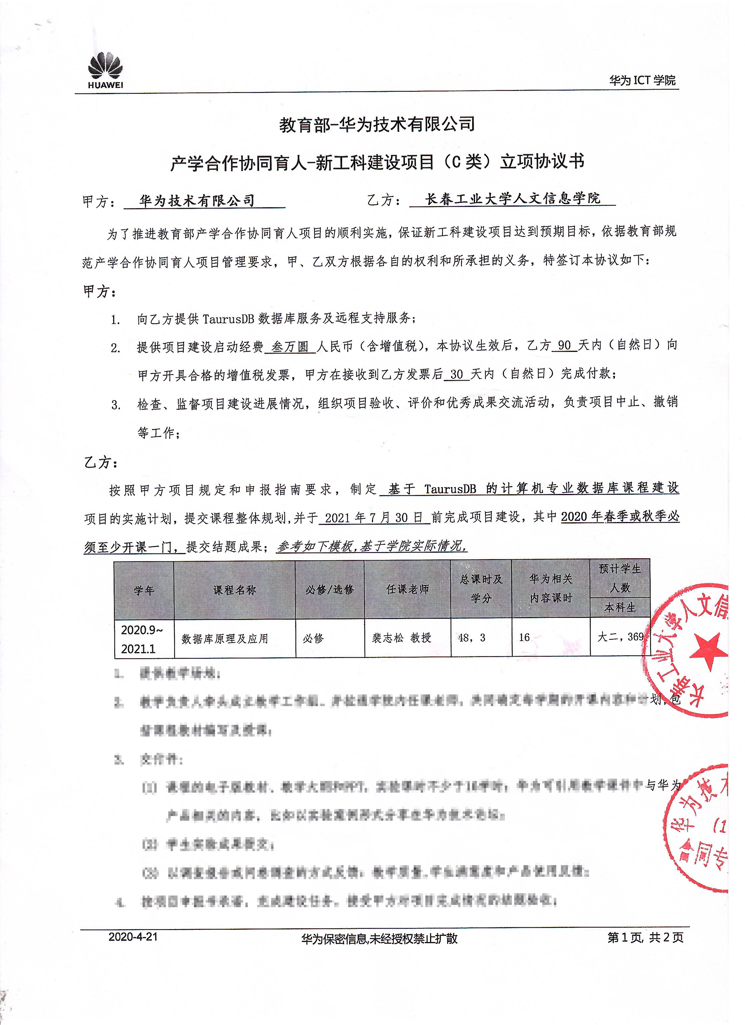 根据《教育部高等教育司关于公布有关企业支持的产学合作协同育人项目申报指南(2019年第二批)的通知》,我院与华为技术有限公司在新工科建设方面开展合作,通过积极申报、项目答辩、沟通交流,最终我院信息工程系申报的《基于TaurusDB的计算机专业数据库课程建设》成功立项。项目经费共13万元,其中包含项目软硬件费用10万元,项目直接资助资金3万元。