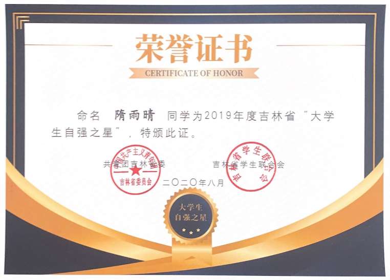 近日,共青团吉林省委、吉林省学联下发了《关于命名2019年度吉林省“大学生自强之星”的决定》。其中,我校外国语学院180124班赵航、管理学院170731班隋雨晴获得2019年度吉林省“大学生自强之星”荣誉称号。
