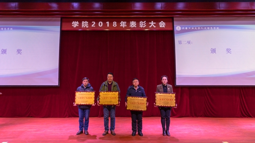 第三项:党委书记程军同志宣读学院《2018年度获得各类奖项情况》。学院荣获各级政府奖励7项;各部门荣获省、市级上以奖励17项;教职工共有49人荣获省、市级以上奖励26项;学生共有502人次、9个班级团支部,在各类竞赛活动中荣获省、市级以上奖励184项。