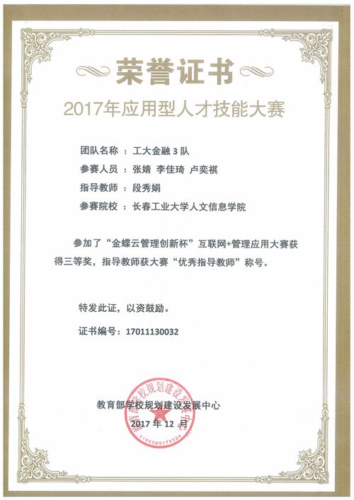 晋级全国总决赛的共有 88 支参赛队300多名选手。竞赛的主题是“激活、创新、前行的力量。”比赛形式包括云管理应用赛、云管理财报赛以及总决赛争夺赛三部分。我院李佳琦、张婧、卢奕祺代表工大金融3队,经过激烈的竞争,在2017年应用型人才技能大赛--金蝶云管理创新杯全国总决赛中荣获三等奖。