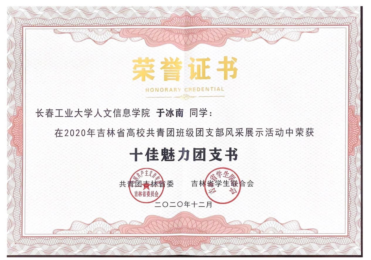 经过多个环节的激烈角逐,我校法学院180212班团支部在2020年吉林省高校共青团班级团支部风采展示活动中荣获“活力团支部”称号、于冰南同学荣获“十佳魅力团支书”称号。