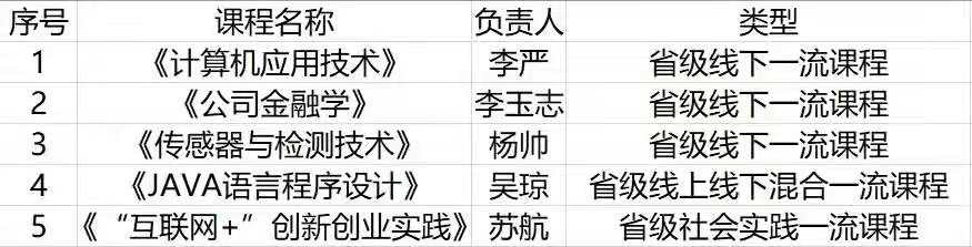 其中李严教授主讲的《计算机应用技术》、李玉志教授主讲的《公司金融学》、杨帅教授主讲的《传感器与检测技术》被评为省级线下一流课程;吴琼教授主讲的《JAVA语言程序设计》被评为省级线上线下混合一流课程;苏航教授主讲的《“互联网+”创新创业实践》被评为省级社会实践一流课程。