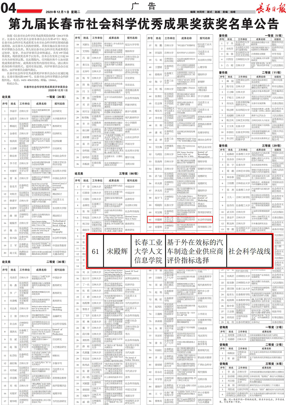 12月1日,长春市社会科学优秀成果奖评审委员会正式公布了第九届长春市社会科学优秀成果奖获奖名单,其中我校管理学院宋殿辉教授的论文——《基于外在效标的汽车制造企业供应商评价指标选择》荣获第九届长春市社会科学优秀成果论文类三等奖。