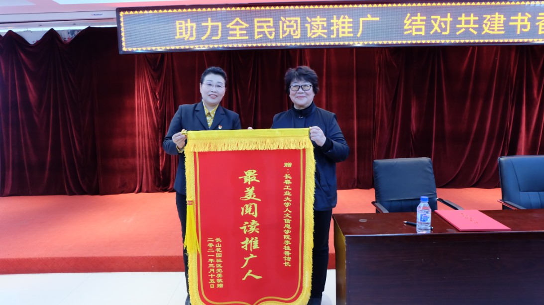 共建仪式上,学校图书馆馆长李桂香同社区党委书记韩丽萍签订共建协议书,学校按照社区居民的阅读需求,定期上门更换循环阅读书籍,社区向学校提供有关阅读的社情民意,营造优良共建环境。仪式上,李桂香馆长赠予长山花园社区第一书记吴亚琴锦旗,盛赞吴书记“守初心、全心全意为人民;担使命、党员学习好榜样”。长山花园社区赠予李桂香馆长“最美阅读推广人”锦旗。