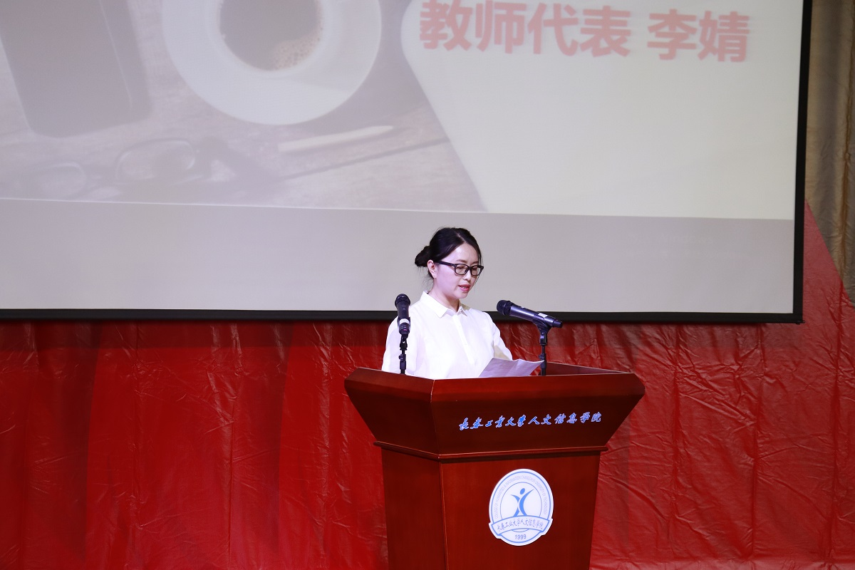 李婧老师代表全体公共计算机基础教研部教师发言,重点讲了自己的成功源于团队,她的荣誉功归于集体。