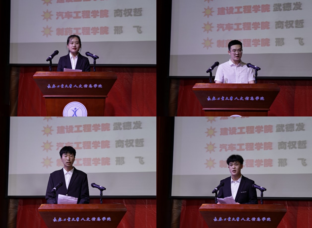 张梦琪、余金泽、武德发、商权哲、邢飞五位同学代表全体获奖同学上台发言。张梦琪获得简报设计赛项一等奖、余金泽获得电子表格赛项二等奖、武德发获得简报设计赛项二等奖、商权哲获得文字处理赛项二等奖。