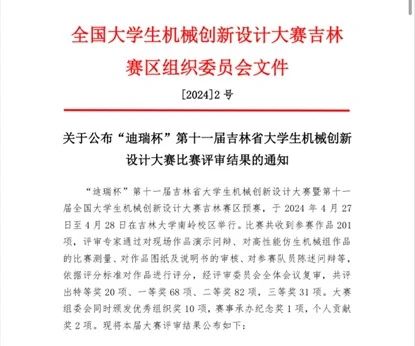 近日,“迪瑞杯”第十一届吉林省大学生机械创新设计大赛暨第十一届全国大学生机械创新设计大赛吉林赛区预赛在吉林大学南岭校区举行。我校机械与汽车工程学院共选派五支队伍参赛,斩获省级一等奖一项、省级二等奖四项。