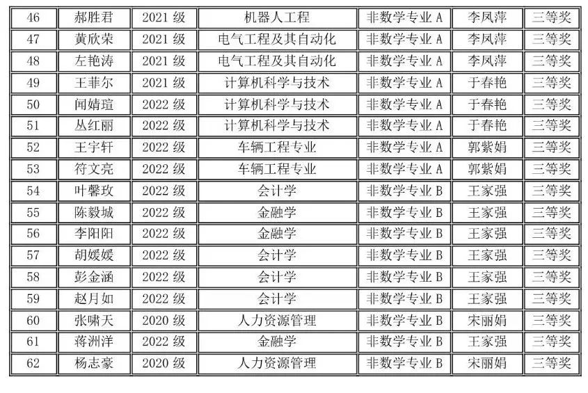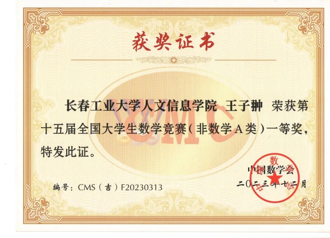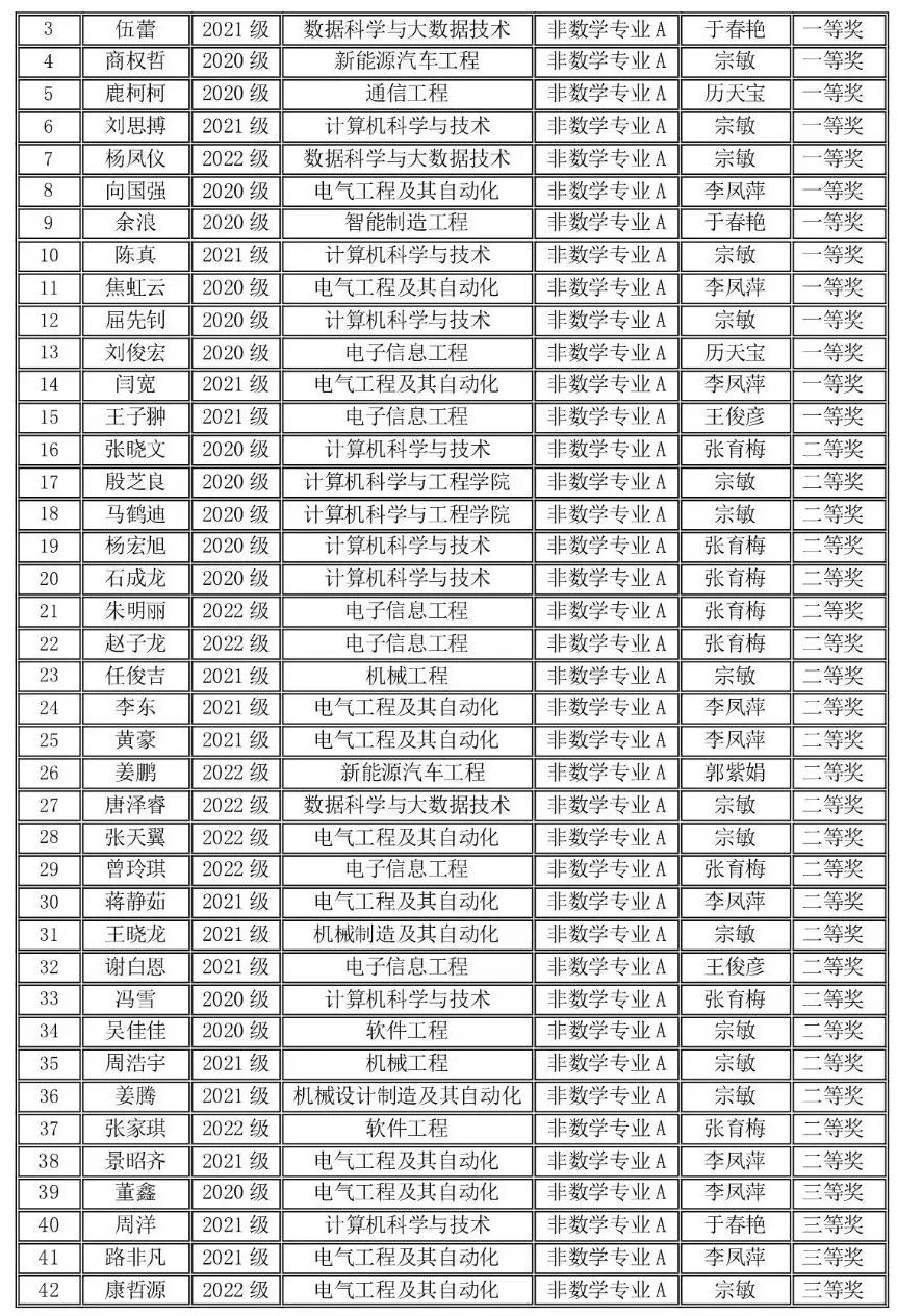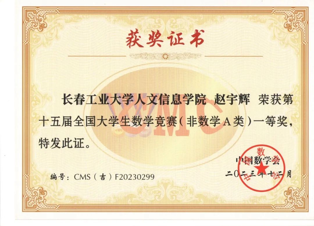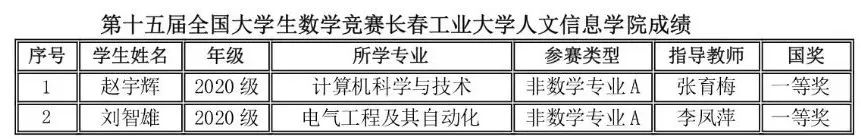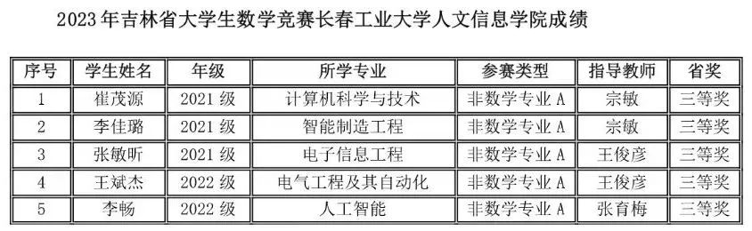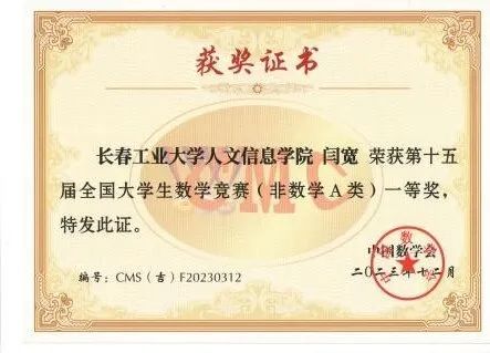 2023年11月11日上午,竞赛在全国各高校同时举行,全国共有1100多所高校28万大学生参赛,我校有210名同学报名参赛,同吉林省20多所高校7500余名学子共同竞技。我校学生在竞赛中取得好成绩,73位同学分别获得全国大学生数学竞赛非数学专业组(A,B类)一等奖17人、二等奖25人、三等奖31人;62名同学获得2023年吉林省大学生数学竞赛三等奖;并且张育梅老师指导的赵宇辉同学最终入选全国总决赛(吉林省30名),取得了历史性的突破。指导教师张育梅、王家强、历天宝获得优秀指导教师奖。学校向获奖的学生和指导教师表示祝贺!