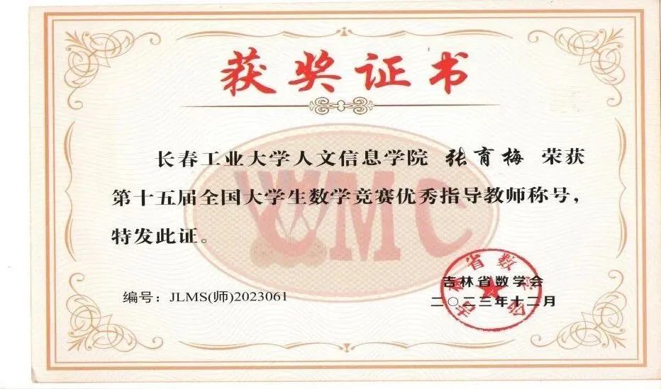 2023第十五届全国大学生数学竞赛优秀指导教师证书