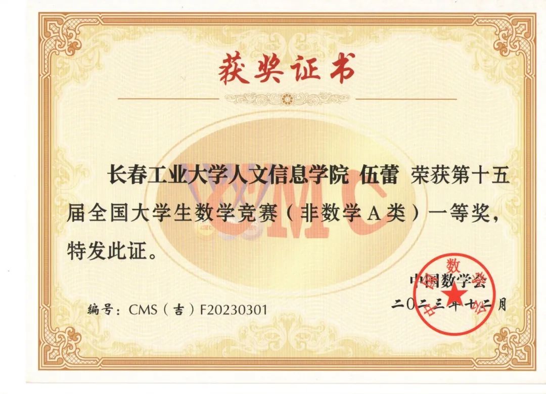 2023年第十五届全国大学生数学竞赛学生一等奖证书
