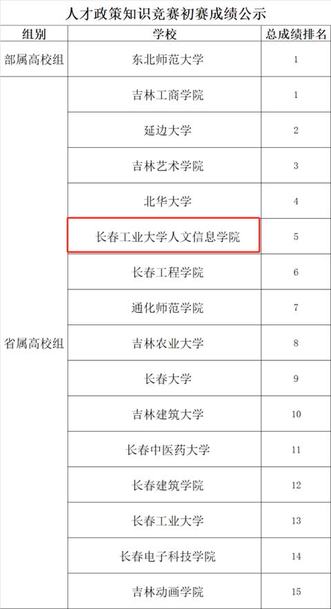 此次竞赛围绕人才相关政策,涵盖人才“引、育、留、用”四方面。在人才认定、职称评聘、薪酬激励、住房补贴、人才公寓、子女教育、医疗保障、出行服务等方面设置试题。我校师生在比赛中拼脑力、看速度、展智慧,结合专业知识更加深入的探讨和解读吉林省人才的相关政策知识,展现了良好的综合素质和应变能力,最终取得了优异的成绩。通过此次参赛,我校师生不但系统的学习和宣传了吉林省积极的人才政策,而且加深了他(她)们对国情、省情的深入了解。