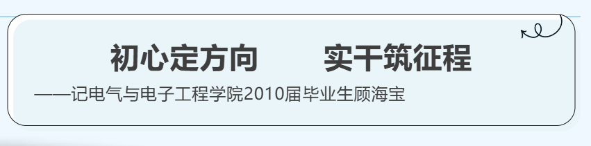 顾海宝,电气与电子工程学院2010届毕业生,先后任职于辽宁曙光汽车集团丹东黄海汽车有限责任公司、青岛特锐德电气股份有限公司、宁德时代新能源科技股份有限公司。他在甲流封校的求职困境中主动突围,从校园招聘中成功入职;又因势而变,毅然从舒适的技术岗转为销售岗,以清晰的自我定位、踏实的工作作风和灵活的处事智慧,在汽车行业深耕十余年,稳步实现职业进阶,用亲身经历沉淀出贴合工科生发展的就业与职场心得,为学弟学妹树立了实干笃行的榜样。