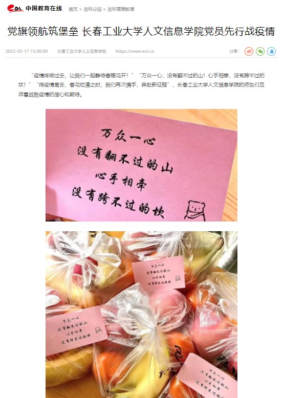党旗领航筑堡垒,党员先行战疫情,奋战在抗疫一线的学校各级党组织和广大共产党员用责任和担当,与全体在校学生一同坚守、风雨同舟、共克时艰,用实际行动生动诠释了“我是党员我先上”的使命担当,为彻底打赢疫情防控阻击战贡献力量!“中国教育在线”“中国吉林网”等媒体对我校党组织战疫工作进行了专题报道。