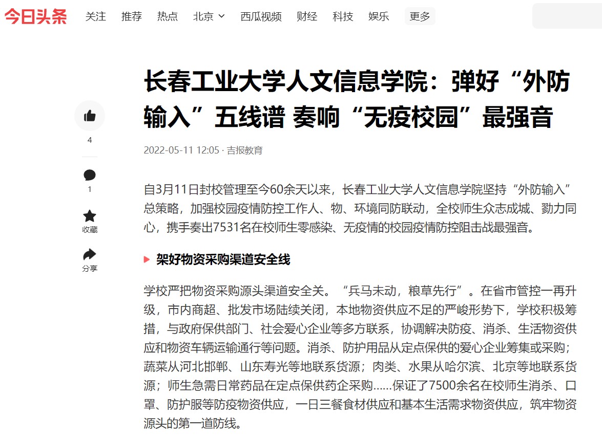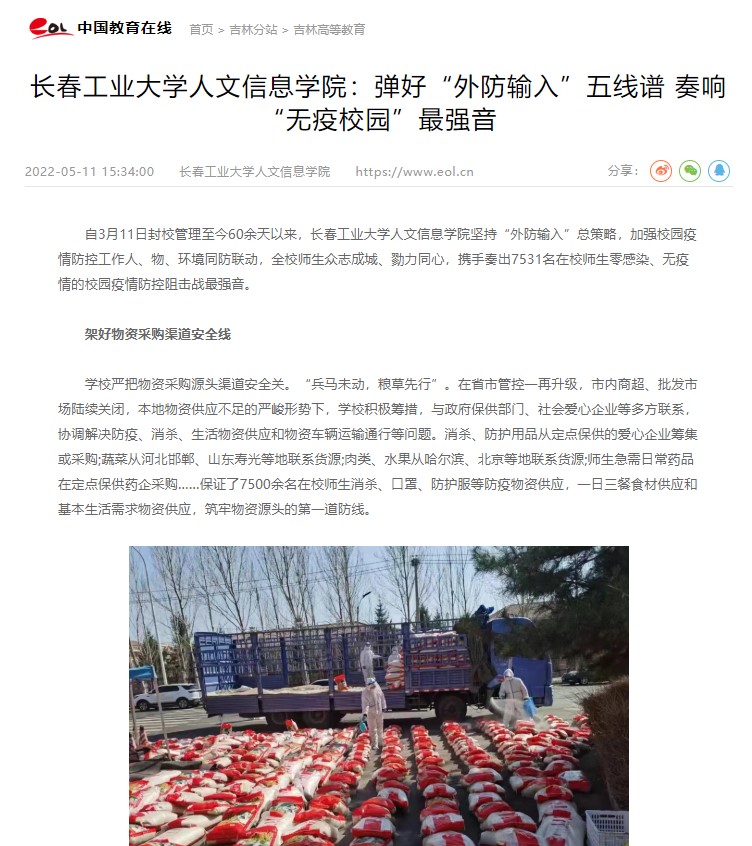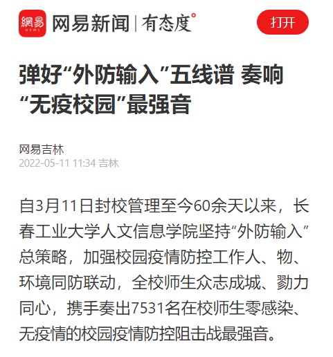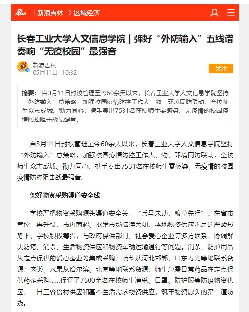 自3月11日封校管理至今60余天以来,学校坚持“外防输入”总策略,加强校园疫情防控工作人、物、环境同防联动,全校师生众志成城、勠力同心,携手奏出7531名在校师生零感染、无疫情的校园疫情防控阻击战最强音。我校疫情防控工作被“中国教育在线”“网易新闻”“新浪吉林”“吉林教育”“吉报教育今日头条”等媒体报道。