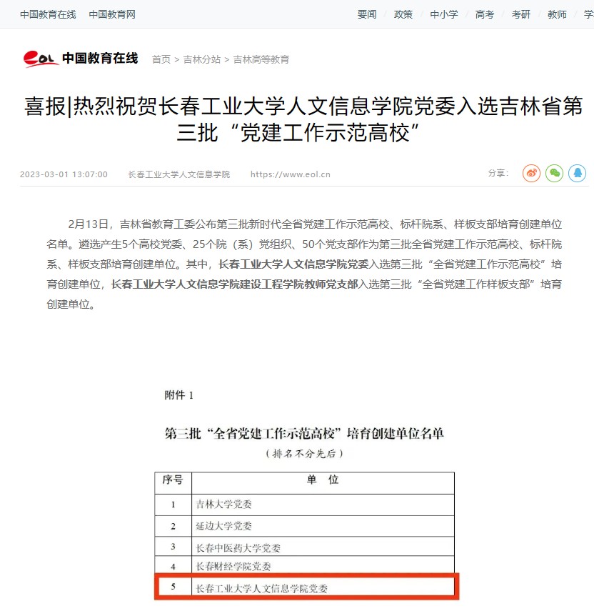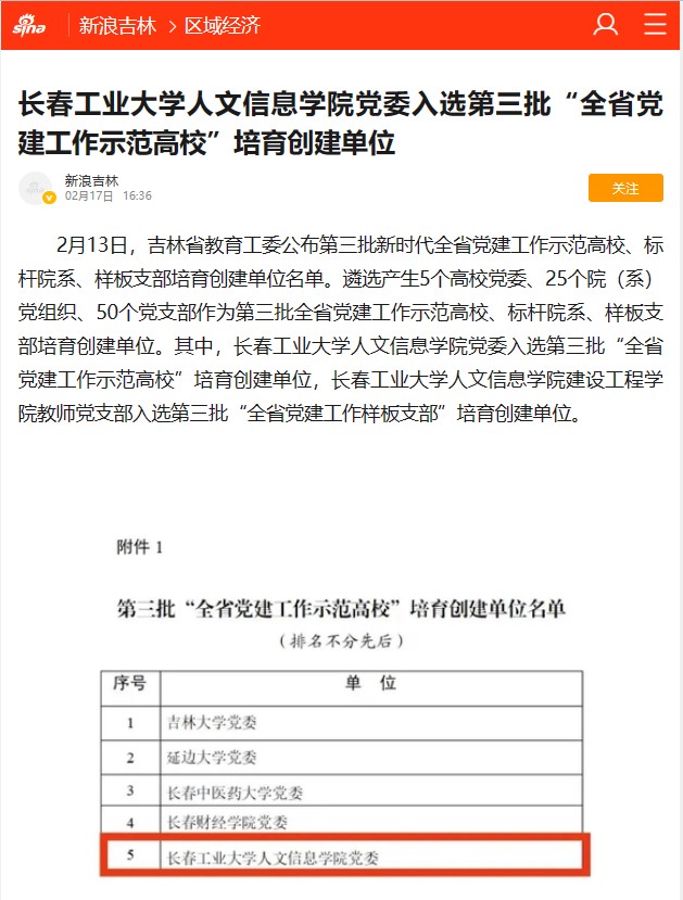 新华网、新浪网、中国教育在线等国家级媒体报道我校党委入选吉林省“党建工作示范高校”