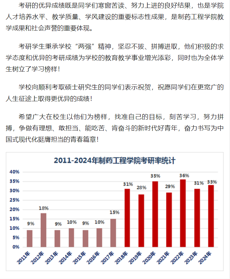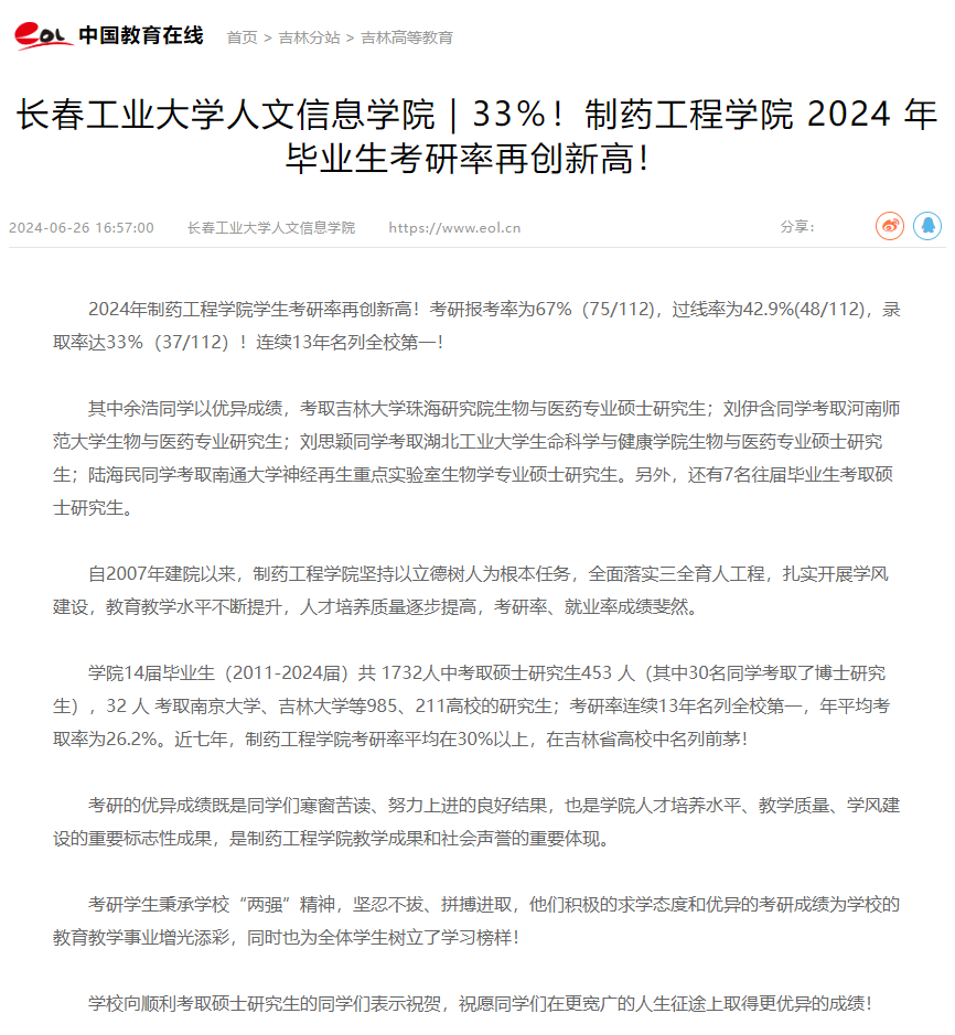 2024年,长春工业大学人文信息学院制药工程学院毕业生考研成功率高达33%,连续13年领跑全校。 新浪新闻,中国教育在线等媒体对我校制药工程学院2024年毕业生考研率再创新高事件进行报道。