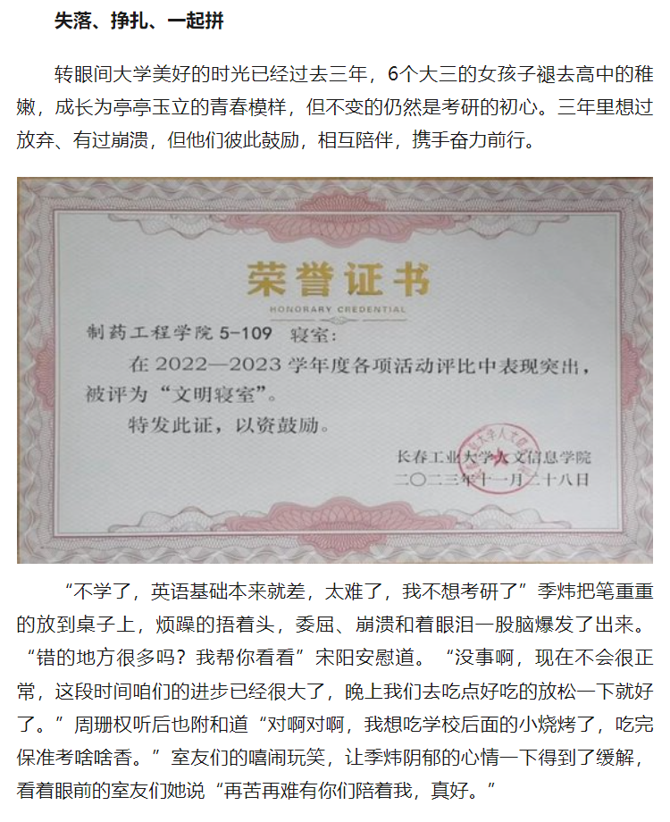 我校制药工程学院五号楼109寝室全员上岸,成功考取研究生!