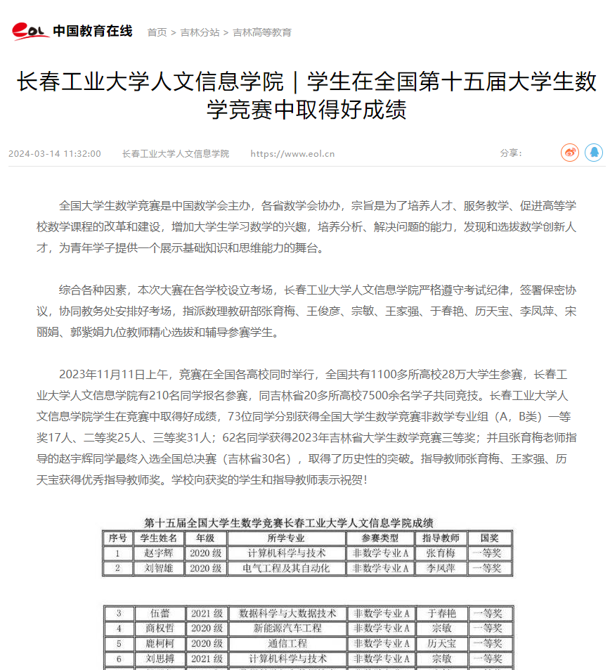 中国教育在线等媒体对我校在全国第十五届大学生数学竞赛中取得好成绩进行了报道.
